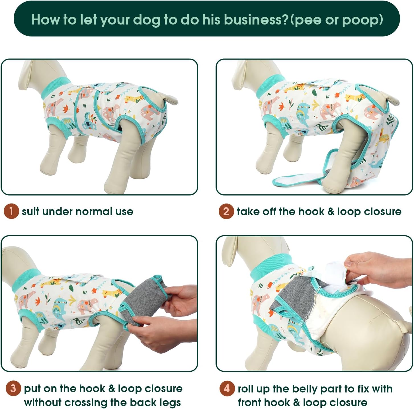 - Easy to Wear: When your dog needs a bathroom break, remove and secure the tapes with provided instructions, aiding wound recovery. Made from machine-washable materials, it's completely safe for your pet