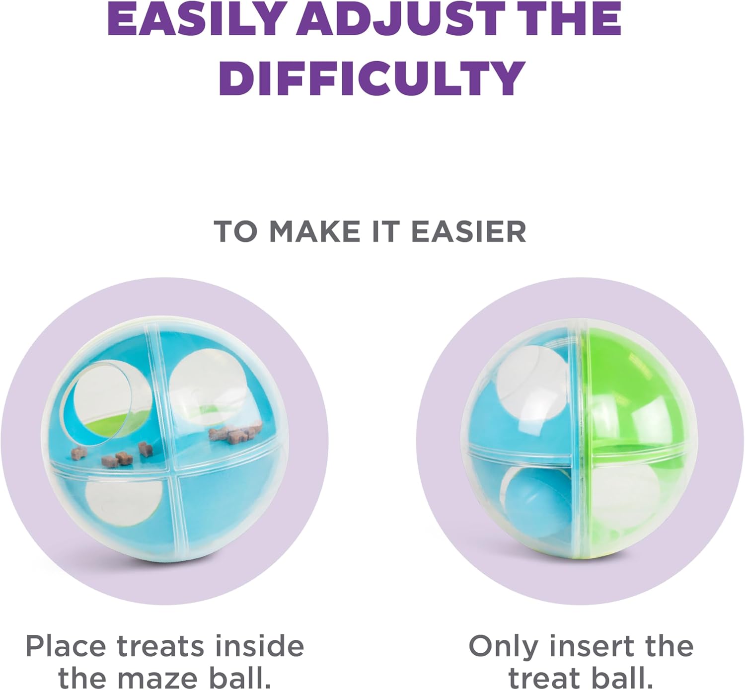 - Three toys in one – dogs roll the A-Maze Ball to release the smaller balls from inside, then roll the treat ball to unleash the treats; check out our Tips & Tricks for ways to make the game easier or harder for your pet