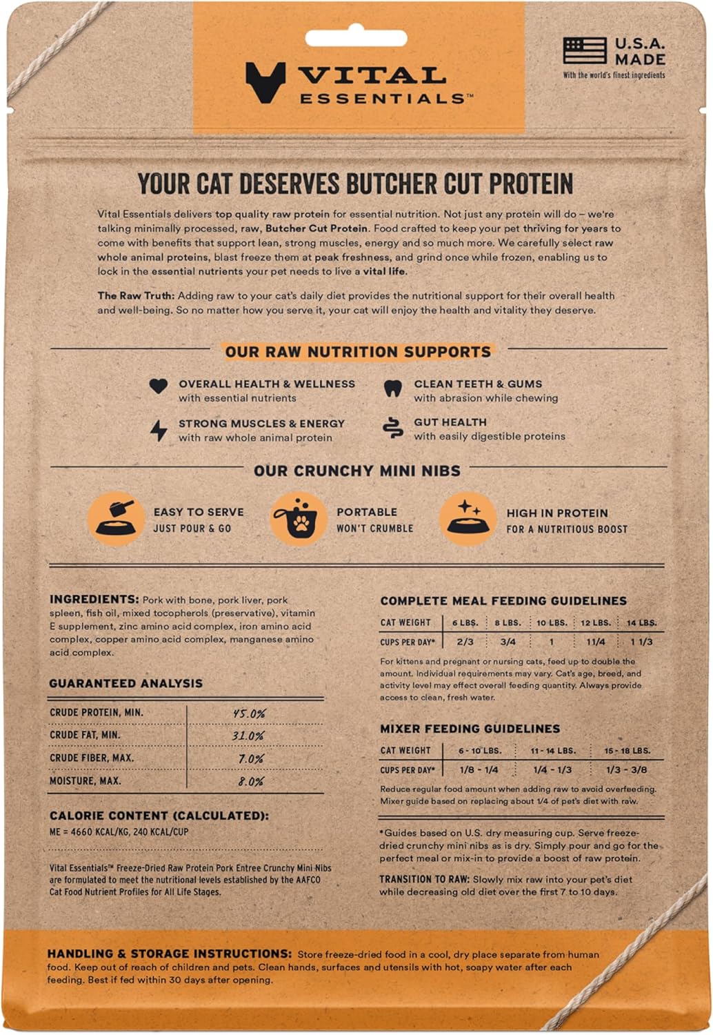 - CRUNCHY FREEZE-DRIED RAW PORK CAT FOOD: Vital Essentials Crunchy Freeze Dried Cat Food packs more protein than industry standard into every bite to deliver the peak vitality your cat deserves, especially when compared to dehydrated cat food. This complete and balanced freeze-dried raw cat food is made with premium butcher cut pork, responsibly sourced in the USA.