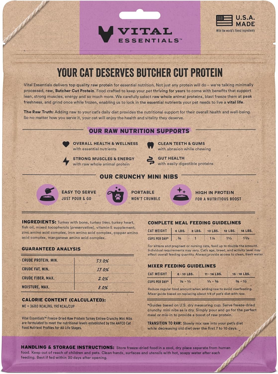 - CRUNCHY FREEZE-DRIED RAW TURKEY CAT FOOD: Vital Essentials Crunchy Freeze Dried Cat Food packs more protein than industry standard into every bite to deliver the peak vitality your cat deserves, especially when compared to dehydrated cat food. This complete and balanced freeze-dried raw cat food is made with premium butcher cut turkey, responsibly sourced in the USA.