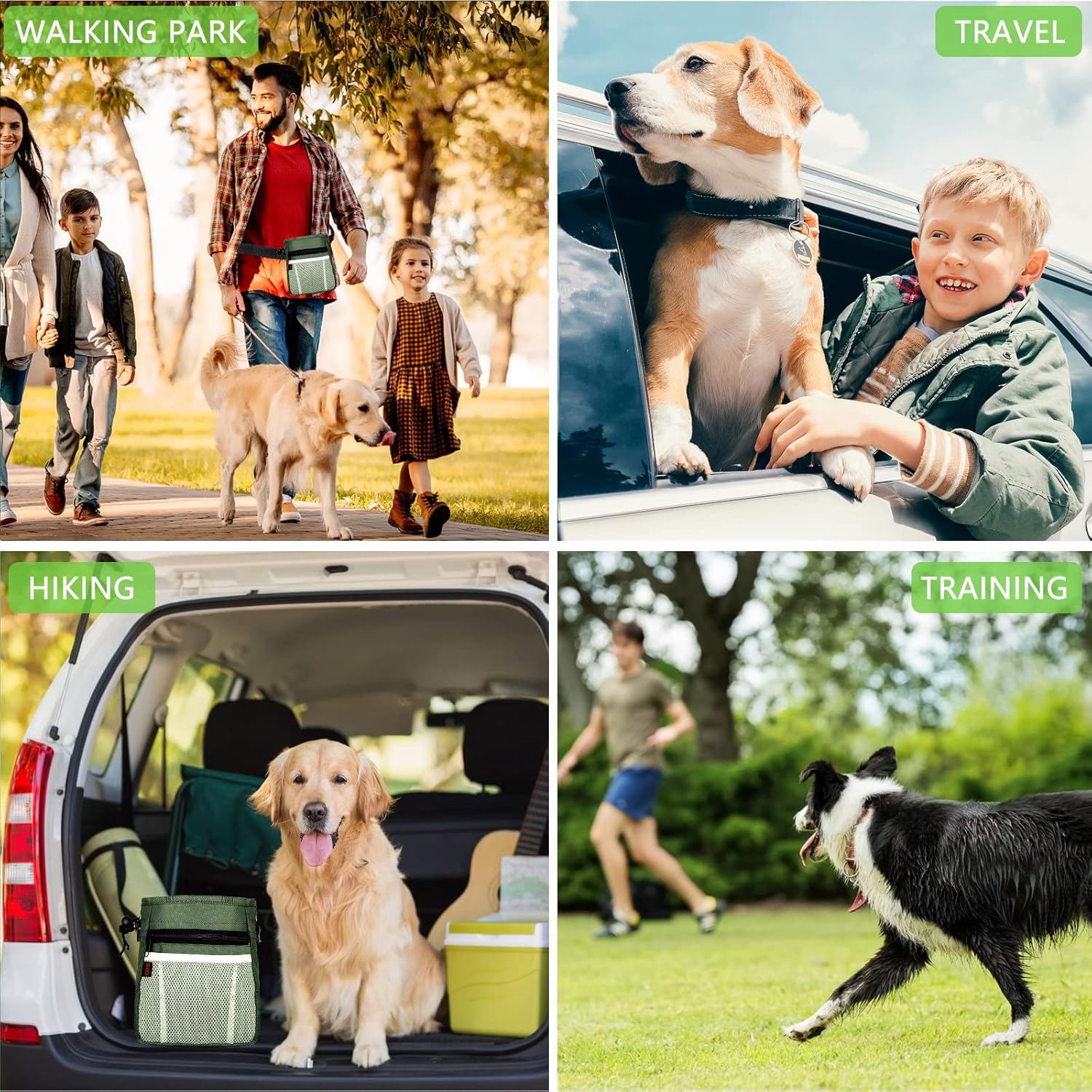 - Large Dog Treat Pouch [Best High-Capacity Option] โ The dog treat bag is capable of holding more treats, accessories, and dog toys (and even larger items, like tennis balls) than most other options on the market. And a poop bag holder on back, so that you can prepare immediately when you need it