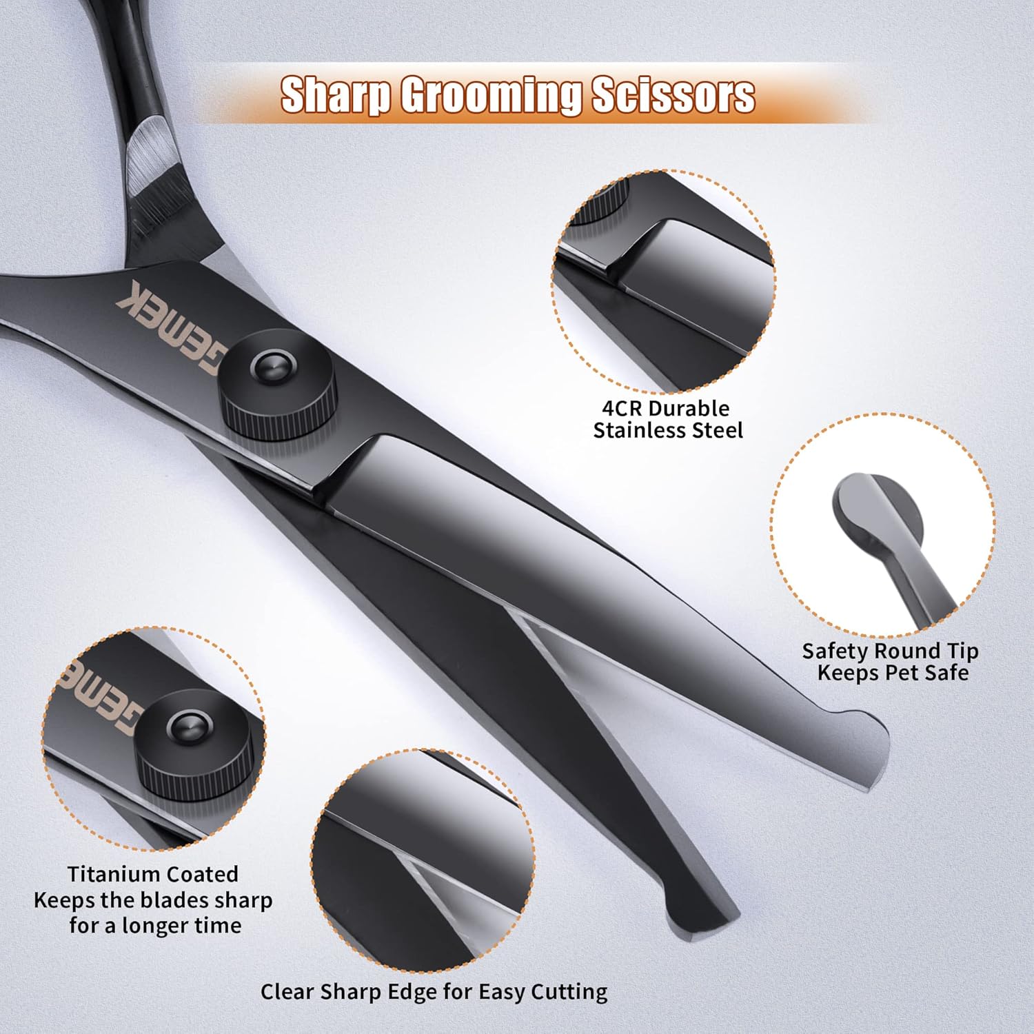 - ✔【Extremely High Quality Stainless Steel】GEMEK's pet grooming scissors are made by high-quality 4CR titanium coated stainless steel with high hardness, the scissors are rustproof, and very sharp to use. quickly and easily trim thick long hair, not pulling on the dog’s hair. Specially prepared 5.1inch round tip straight edge scissors, more suitable to cut puppies and small pet's hair around eyes and ears.