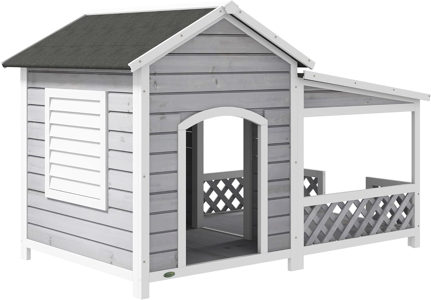- Roofed Porch: Surrounded with cute fence motifs, an attached patio upgrades our large dog house. This porch offers roof-protected fresh air in a roomy 2-in-1 design.