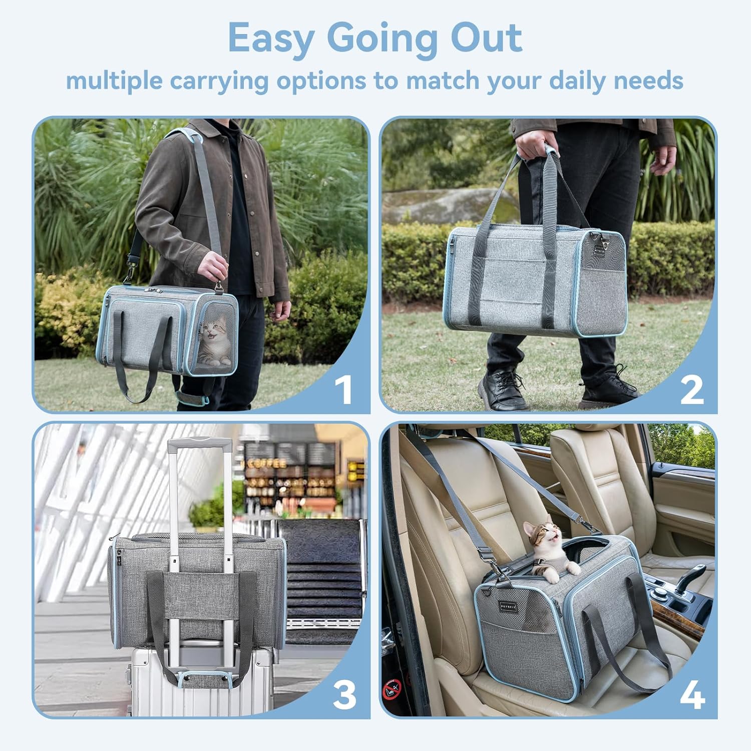 - 【Multiple Ways to Carry】Self-lock zipper to prevent your pets from escaping. A strap on one side can be slid around the extendable handle of rolling luggage. Two flexible handles to hold with your hands. Additionally, it provides a longer, detachable strap to hang on the shoulders and has a side pocket for storage