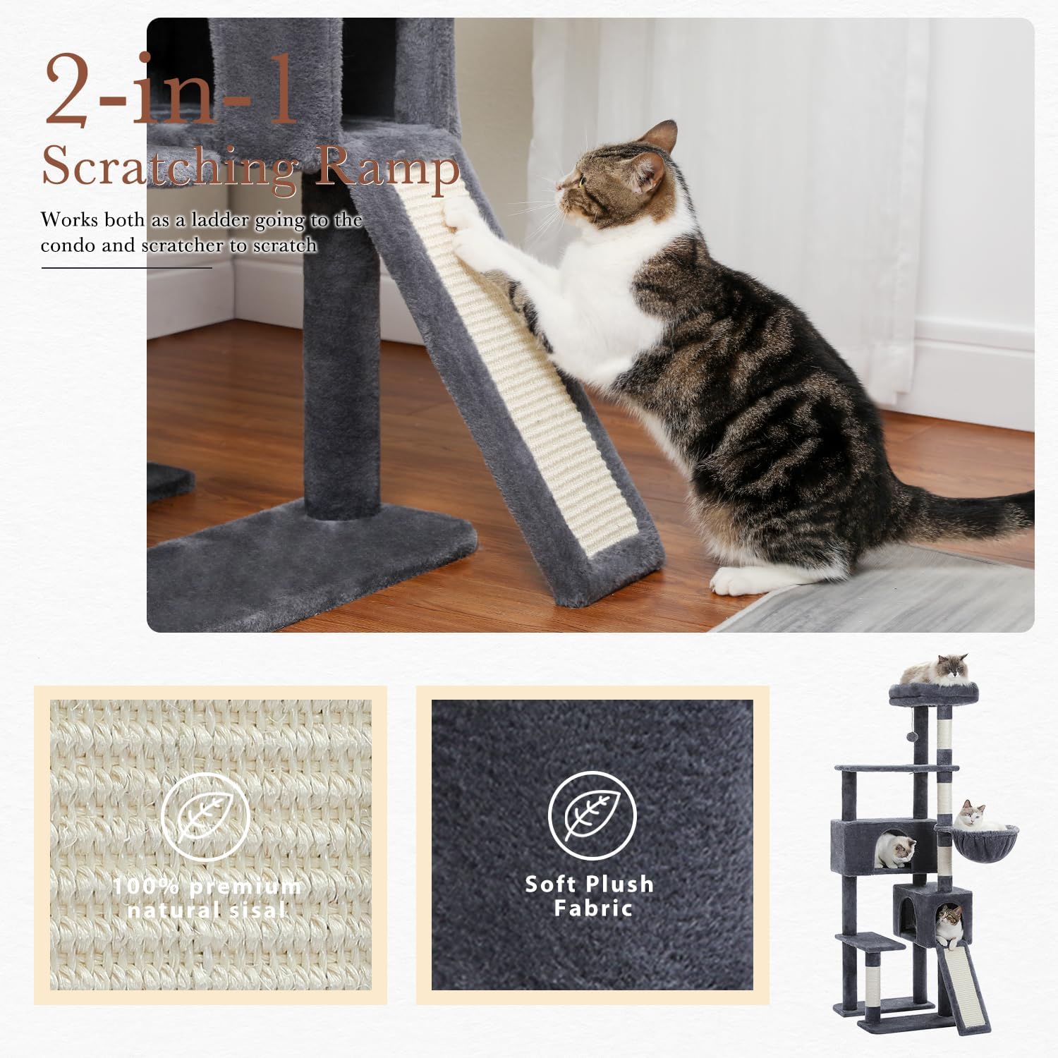 PAWZ Road Cat Tree, 60 Inches Cat Tower with Dual Condos, Spacious Perch, Cozy Basket and Sisal-Covered Scratching Posts for Indoor Cats- Dark Gray
