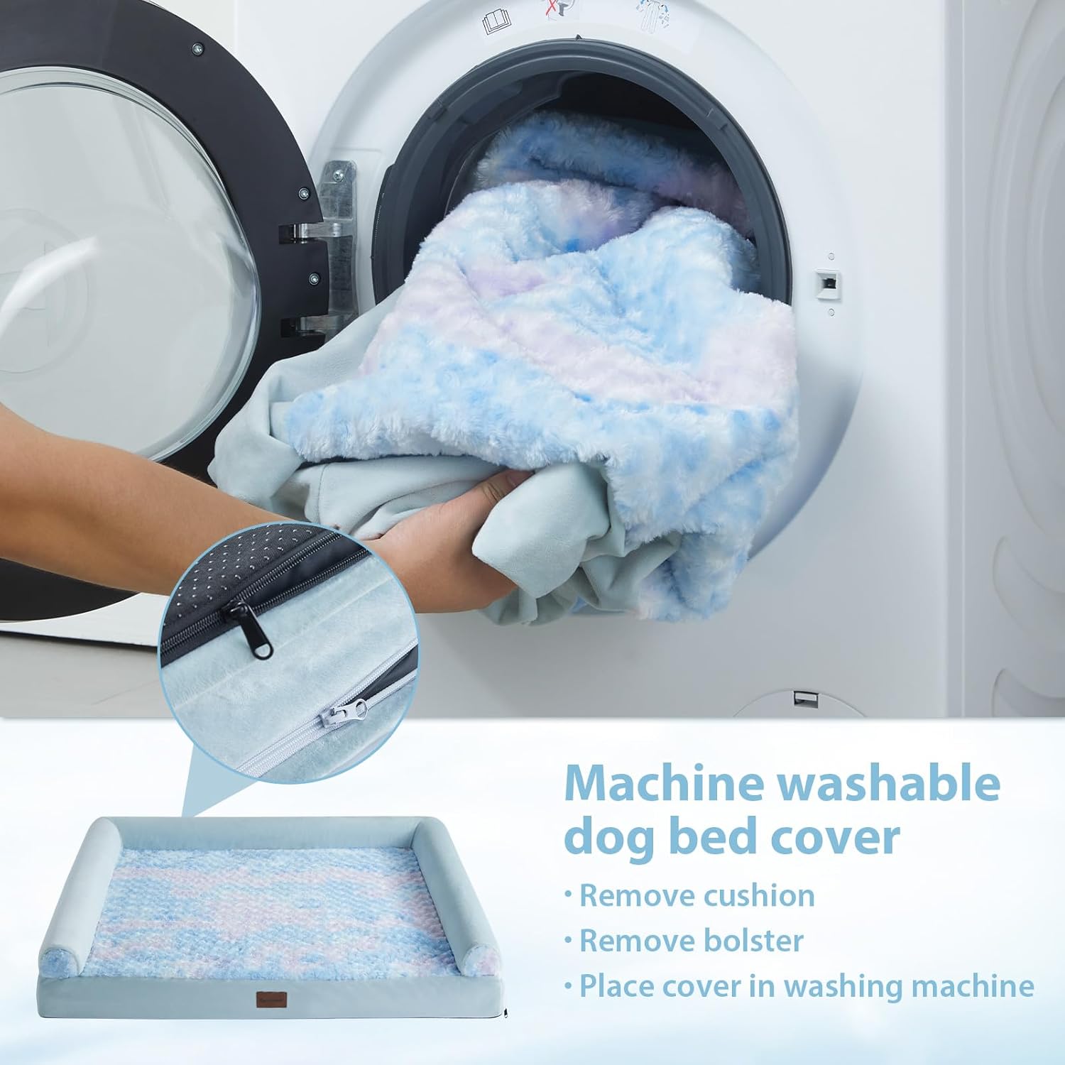 • WATERPROOF DOG BED & REMOVABLE DOG BED: The 3 side zippers on the dog bed cover make it easier to remove or put together for quick cleaning and easy care. The waterproof inner layer protects the egg foam from leaking urine and drool, allowing your puppy to use it with confidence at any time.