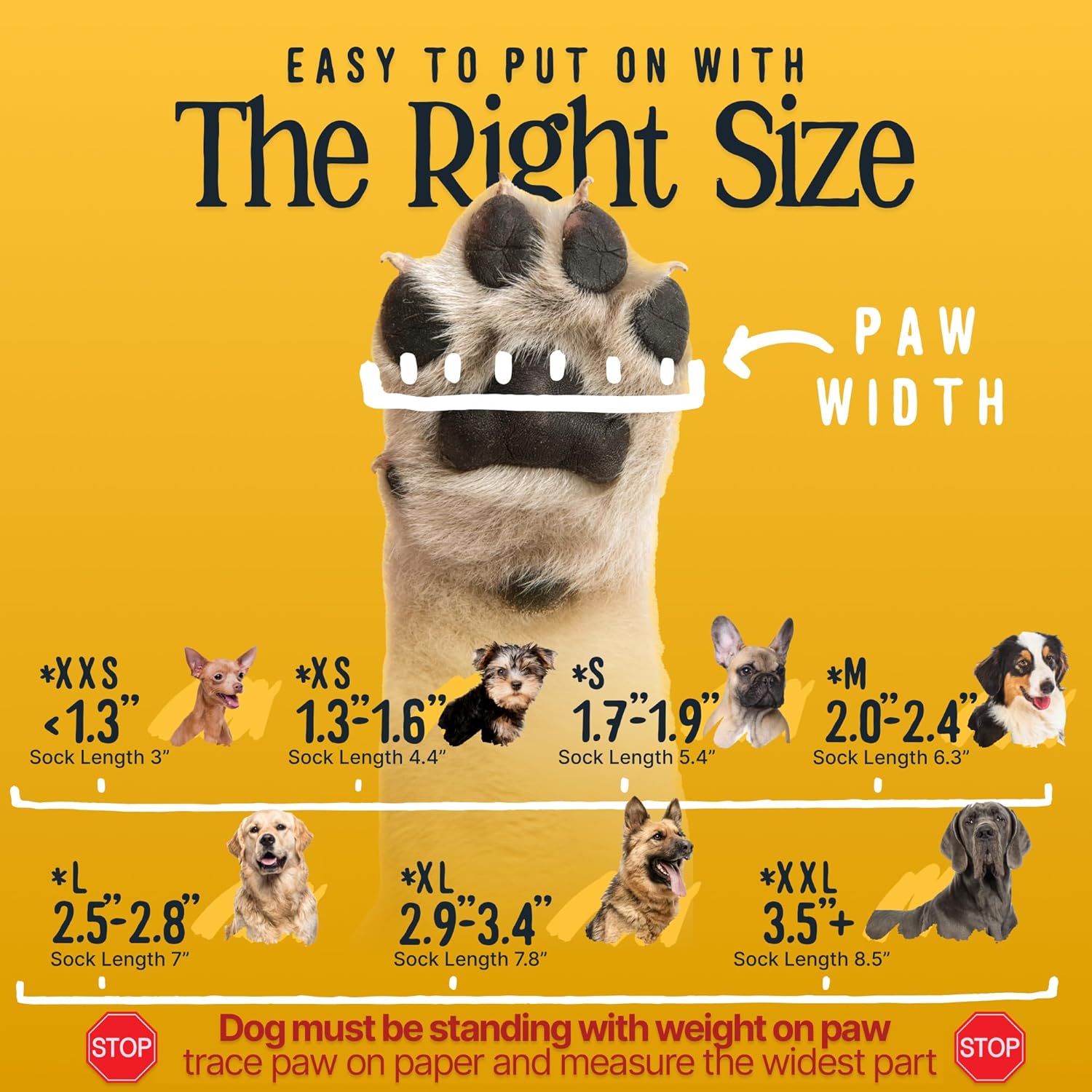 - XL fits paws 2.5" - 2.8". Measure while dog is standing with weight on paw. Includes 4 dog grip socks. Snug fit is normal—extra grip makes them stiffer than other socks but provides better traction.