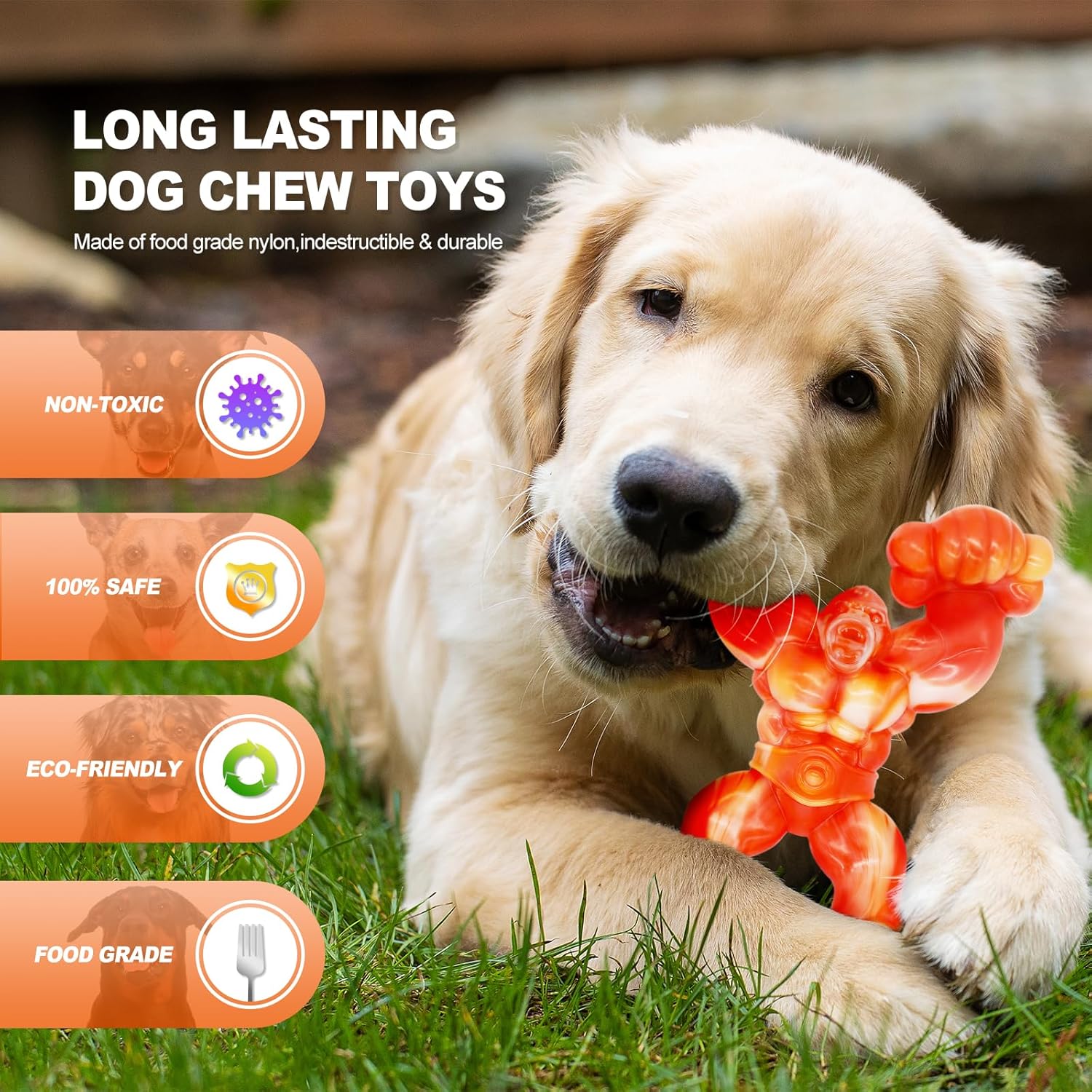 - Durable dog chew toy: Made of food-grade nylon, our dog toys for aggressive chewers are more chew-proof than real bone to satisfy dogs' natural urge to chew and gnaw. Indestructible dog toys for aggressive chewers and dog toys for large dogs aggressive chewers went through tests by 30-100lb aggressive chewers like Huskies, Boxers, etc. Our chew toys for aggressive chewers are such almost indestructible dog toys for large dogs that aggressive dog chew toys can withstand dogs 'prolonged chewing