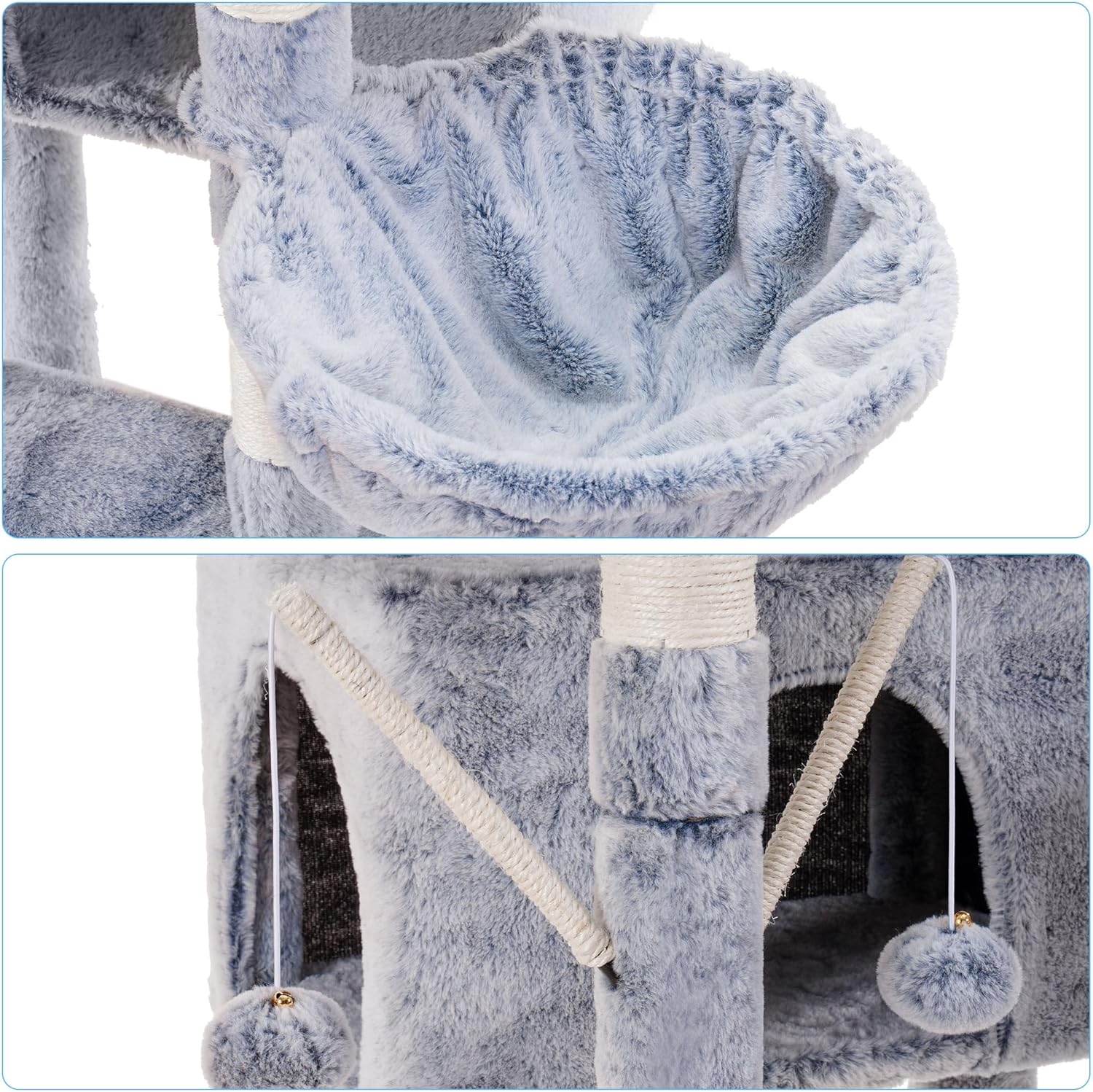 - Two hammocks in different shapes: A cozy basket-shaped hammock is cat's favorite, giving kitties a feeling of been wrapped up, like sleeping in a soft cloud. The hammock in the middle of the cat house adds more interest to curious cats