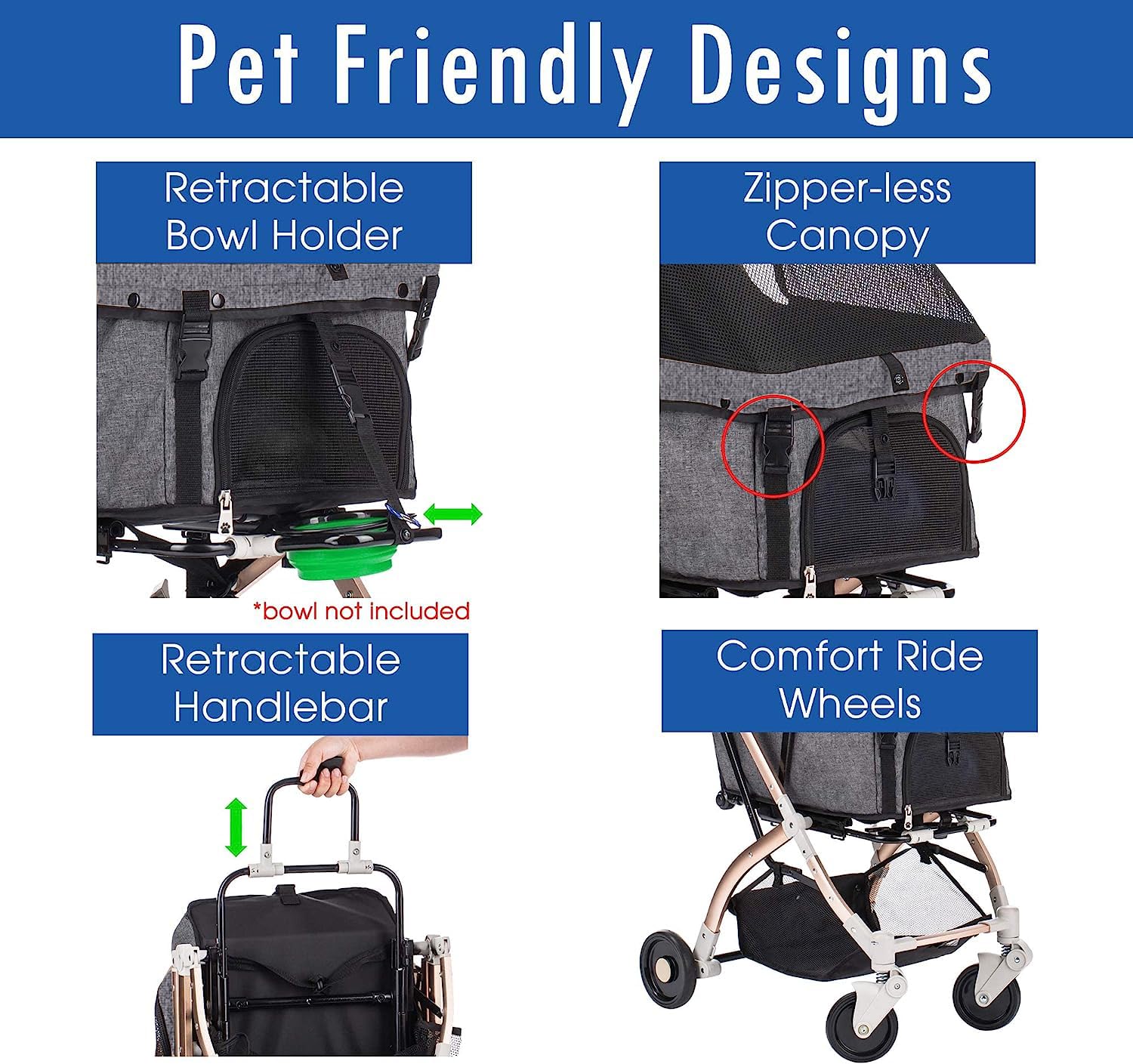 - PET-CENTRIC DESIGNS This premium pet stroller features a retractable meal bowl holder to feed your pets at any time, and two tethers in the basket buckle your pets in snugly. It also includes two machine-washable carrier pads and durable water-resistant fabric. Three organizer pockets and a large under-basket made traveling easy and tidy