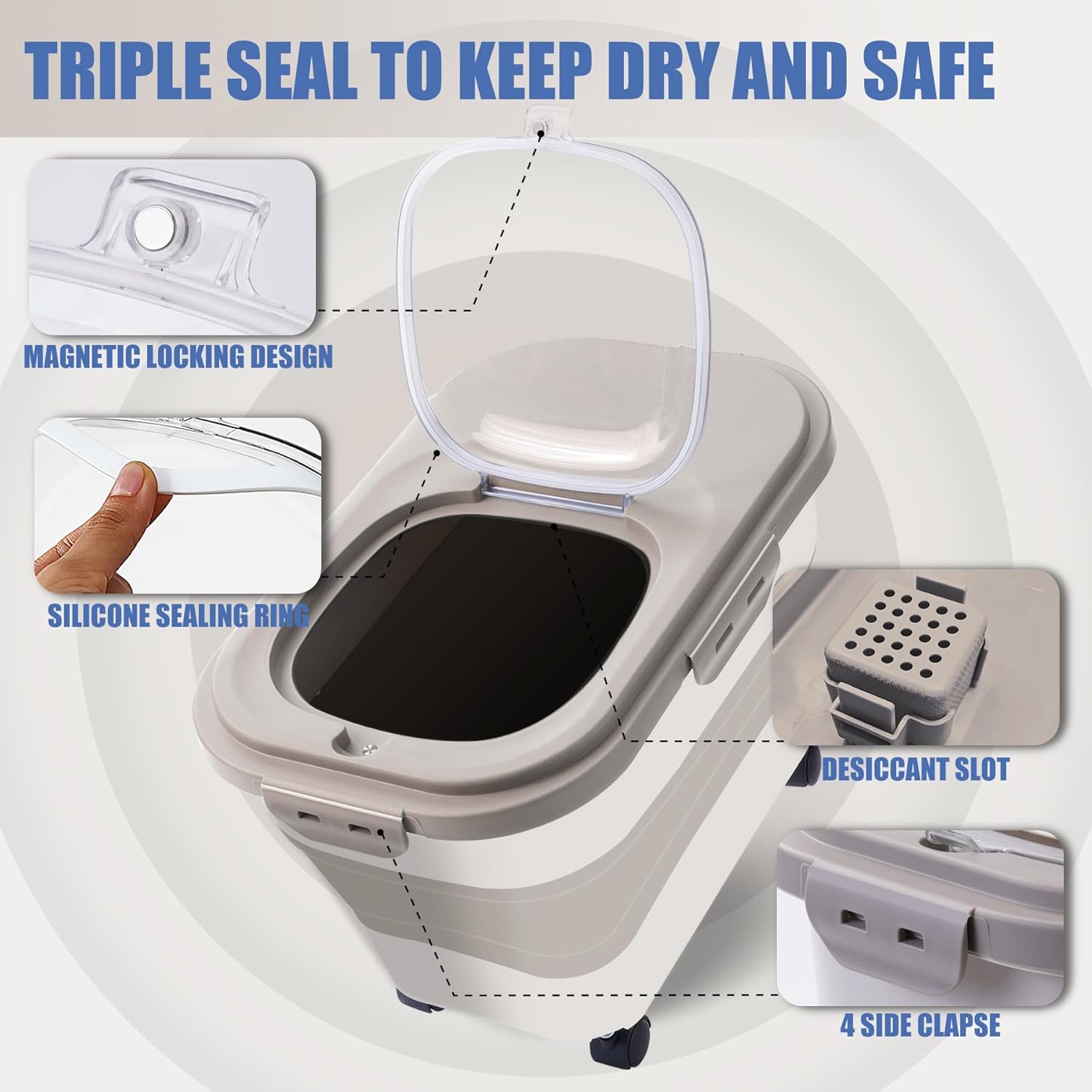 - 🐶【Removable Wheels】Are you tired of struggling with the unwieldy weight of heavy pet food bags? Our dog food containers are carefully designed with four detachable wheels. Imagine being able to effortlessly slide your pet's food container through different rooms in your house, or take it outdoors for a picnic with your beloved furry friend. It was a wonderful feeling!
