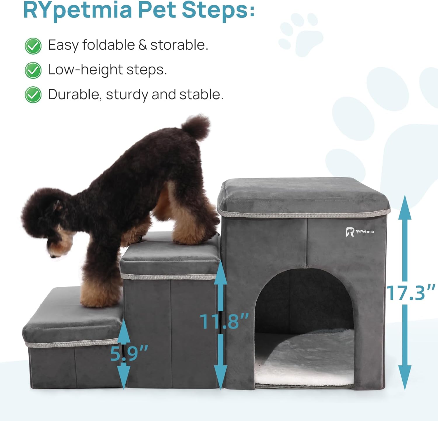 Foldable Pet Stairs for Beds & Sofas - Non-Slip Dog Steps with Storage for Small to Medium Dogs & Cats, Supports up to 120 lbs - Durable 2 & 3-Step Doggie Ladder for Easy Access