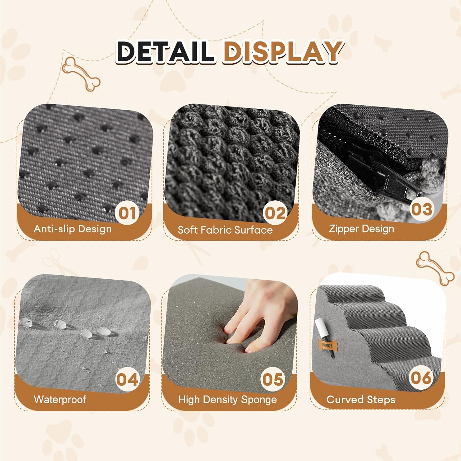 - STABLE AND NON-SLIP: Surface layer of the dog ladder is made of thick coral fleece, providing a soft and non-slip experience for your pet's feet. Back of the coral fleece is a waterproof layer, so you won't worry about the dog peeing. Side of the dog stairs for high beds is made of wear-resistant cotton and linen so that dog can grind it's paws. Bottom is made of non-slip nylon, which can be firmly attached to the ground to ensure the stability of the dog steps, and dogs can climb easily