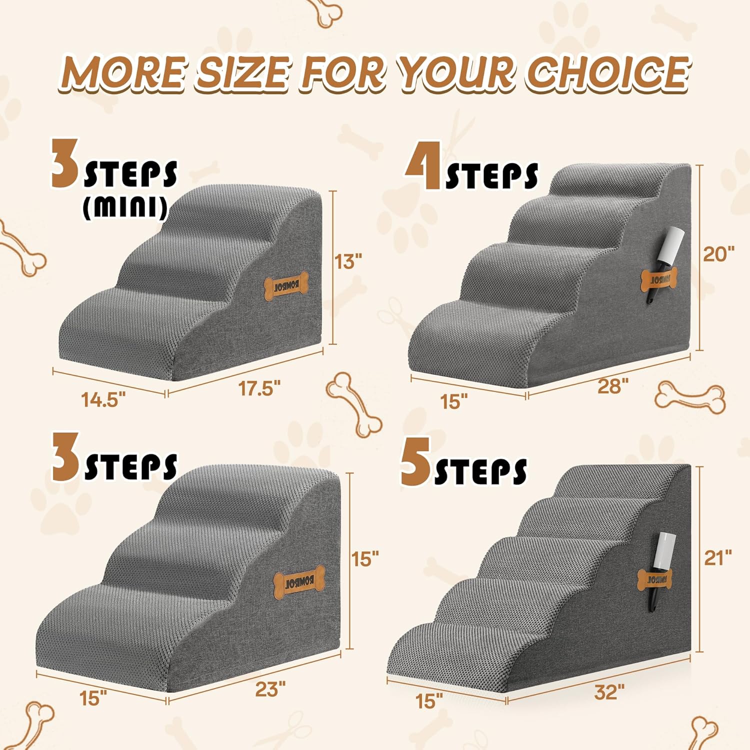 - Please note that due to trimming and vacuum compression, the sponge may take a minimum of 48 hours to fully rebound, and there may be variations in size. Our dog stairs come in a variety of heights, colors, foam densities, and shapes to suit your taste and your pet's needs. Choose the ideal combination for your space and your pet’s comfort. suitable for small and medium dogs