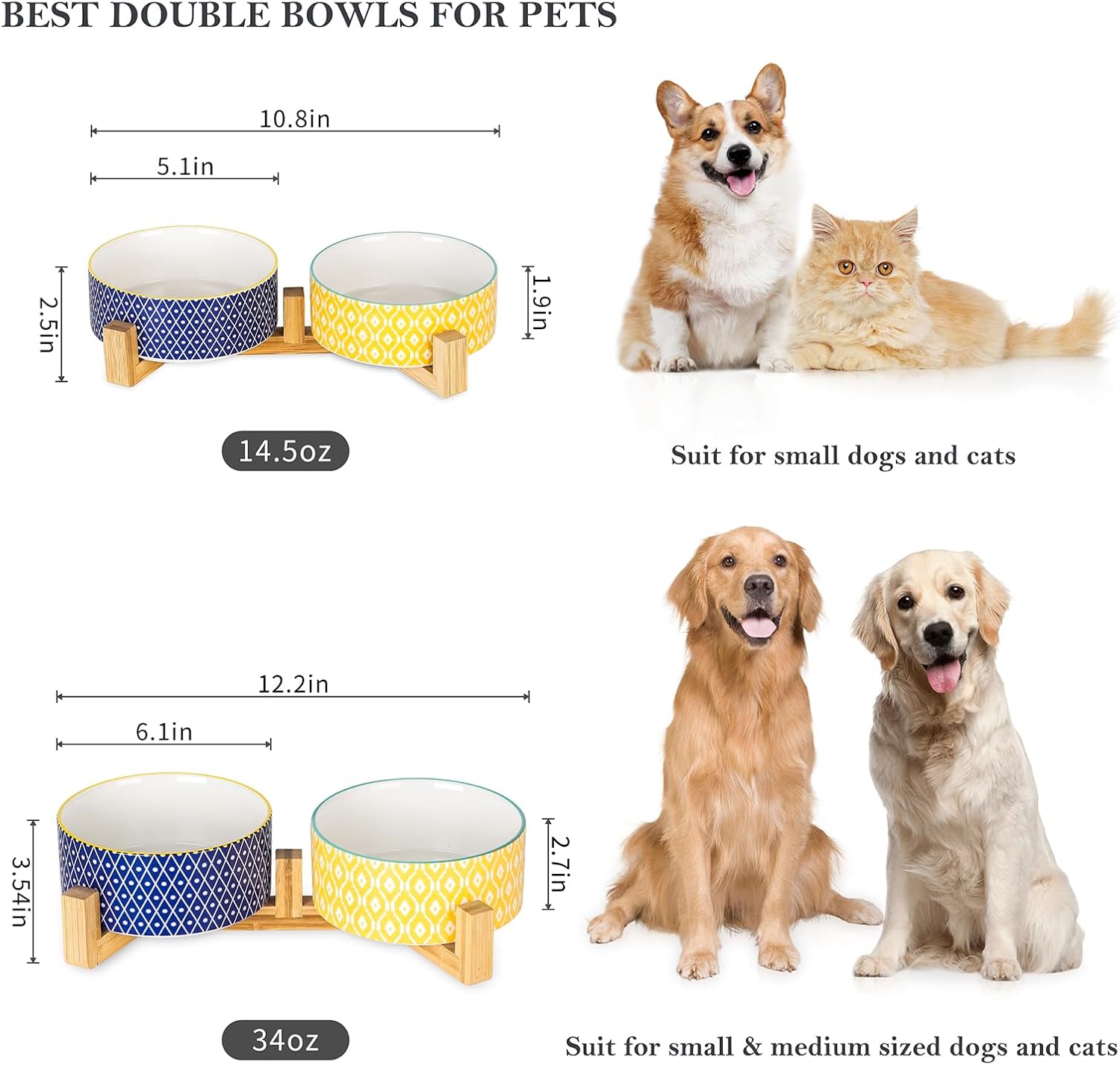 - DOUBLE BOWLS, DELICATE DESIGN - The thoughtful design of these double bowls offers convenience for your pets. You can use one bowl for food and another one for water, raising the dishes closer to your pet for more comfortable eating. Decorated with colored flowers and geometric patterns, these make them more unique that fit perfectly with any home decor style.