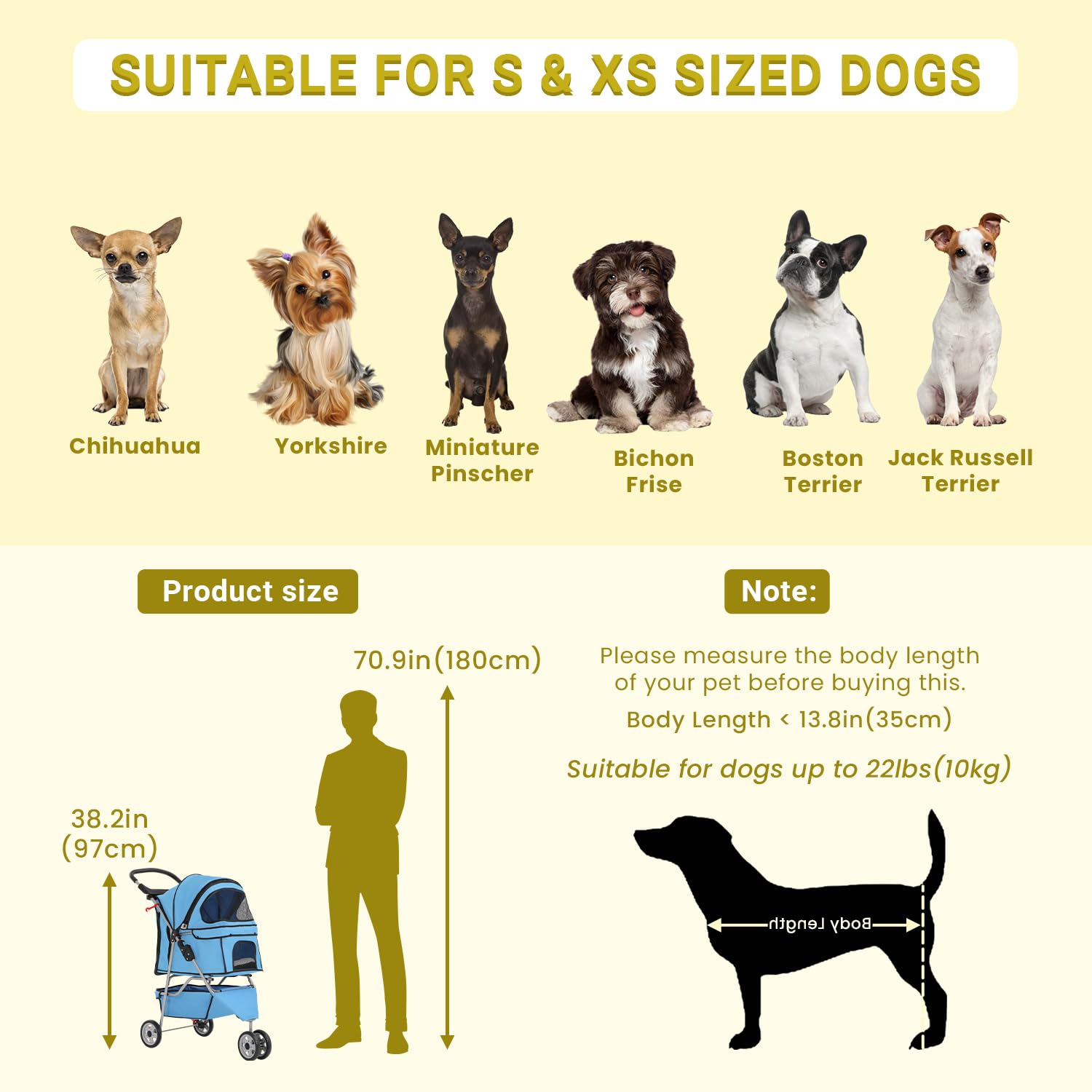 - 【Safe and Comfortable Design】This jogger stroller's handle is soft material and it also features a pad inside the cart for added comfort. With overall size of 35''L x 17.5''W x 38.6''H, Suitable for pets up to 35 lbs,providing a spacious and comfortable space for your pet. 360-degree rotating front wheels with turn lock function, and rear braking system can keep your pet safety.