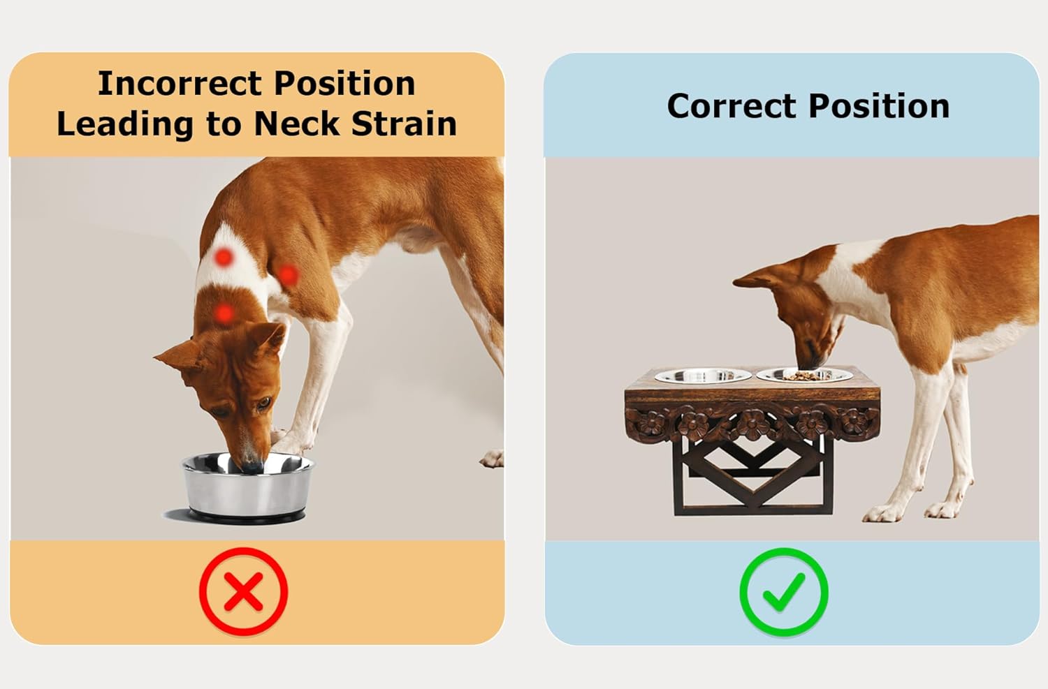 Elevated Pet Feeder for Dogs and Cats - The Bali Carved Wood Pet Feeding Stand with Two Stainless Steel Bowls - Three Heights Adjustable Raised Dog Bowl - Food Water Pet Feeding Station - IRONGATE