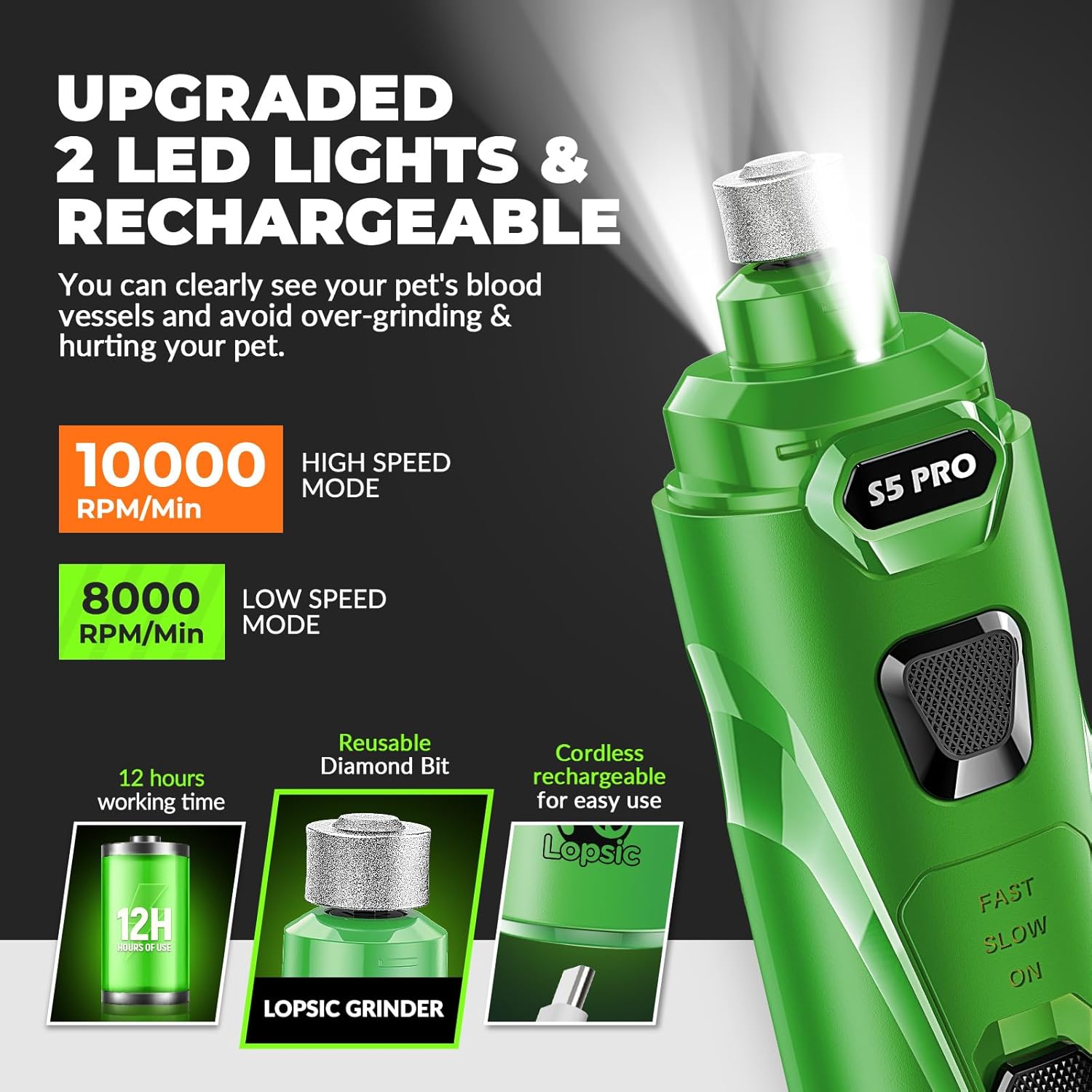 - 【Improved Precision: 2 LED Lights & Adjustable Speeds】: LOPSIC dog nail grinder for dogs features 2 LED lights that offer clear visibility of the quick, ensuring precise and safe nail trimming for your pets. The adjustable speeds(8,000 RPM to 10,000 RPM) of dog nail trimmers can adapt to small, medium and large pets nail trimming needs. When using the dog nail trimmers at the proper speed, pet nails of different hardness can be efficiently ground