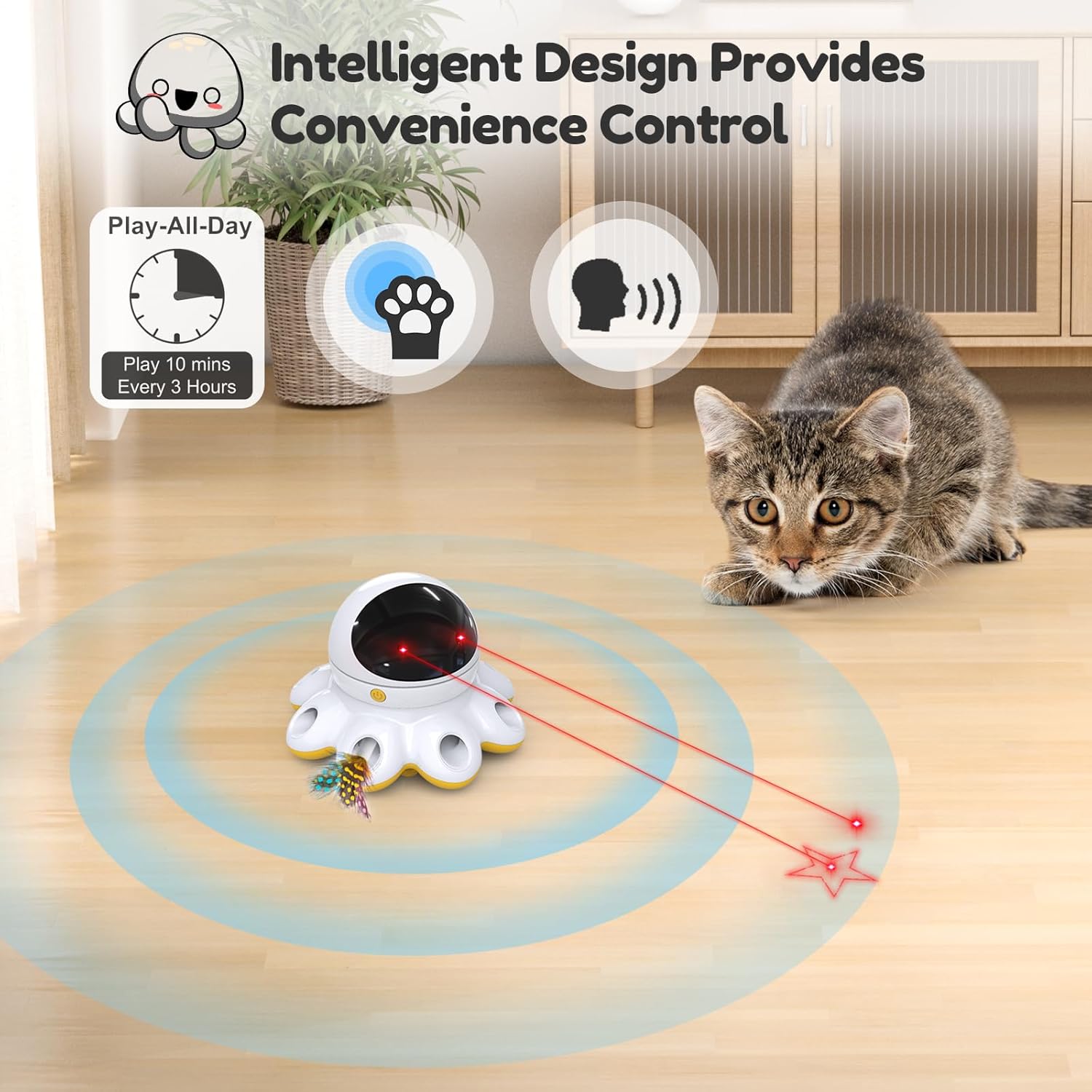 • 【2-in-1 Cat Laser Toys】Unique dot and star double laser patterns, combined with automatic 360°random laser trajectory of Fast, Medium and Slow lasers, unpredictable movement stimulates cats to chase and play. Feathers shoot out randomly from 8 holes, encouraging your cat to pounce and flap. Perfectly match various scenarios, no need to worry about indoor cat hit anything that might fall or break.