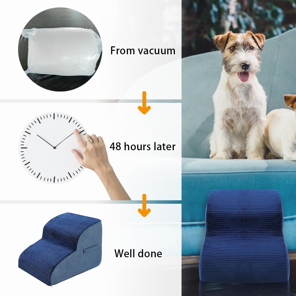 - [ Special Attention Notes ] --- Our pet stairs are adopts vacuum compression packing, after unpacking, the foam will slowly rebound to its normal size, generally, it will take about 24-48 hours to rebound to the largest size. Please note that the foam is not washable.