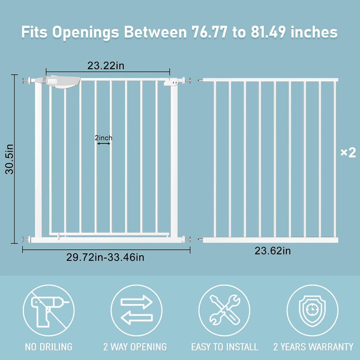 WAOWAO Triple Lock Baby Gate Extra Wide 76.77-81.49" Pressure Mounted Walk Through Swing Auto Close Safety White Metal Dog Pet Puppy for Stairs,Doorways,Kitchen