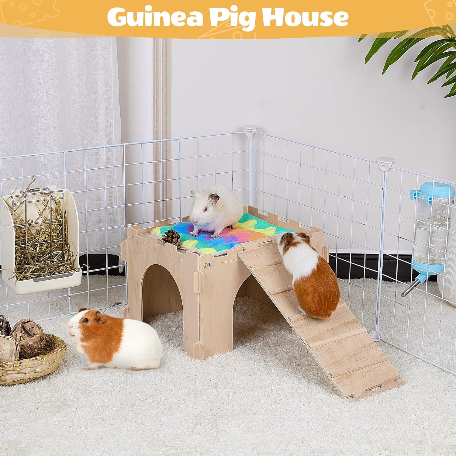Guinea Pig Hideout, Guinea Pigs House with Stairs and Mats Extra Large Guinea Piggy Castle Detachable Hideouts for Small Animals Wooden Guinea Pig Habitats with Multiple Doors and Windows