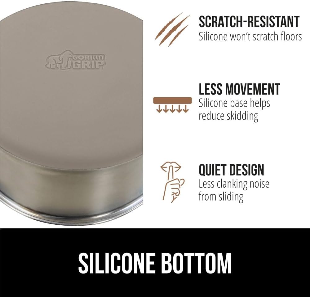 - SILICONE BOTTOM: the Gorilla Grip bowl is constructed from durable silicone that helps keep the bowl steady and won’t scratch your floors; while some over eager eaters may still be able to slide the bowls, the silicone will help prevent much movement; plus, it reduces the noise from clanking and sliding across wood, tile, and more