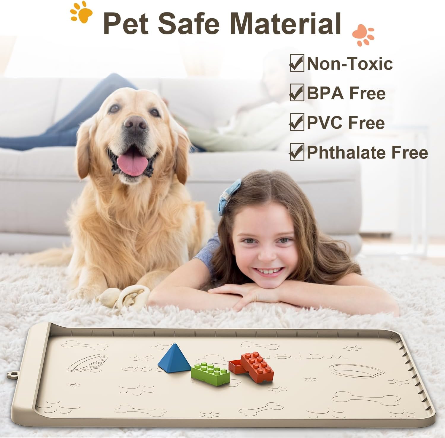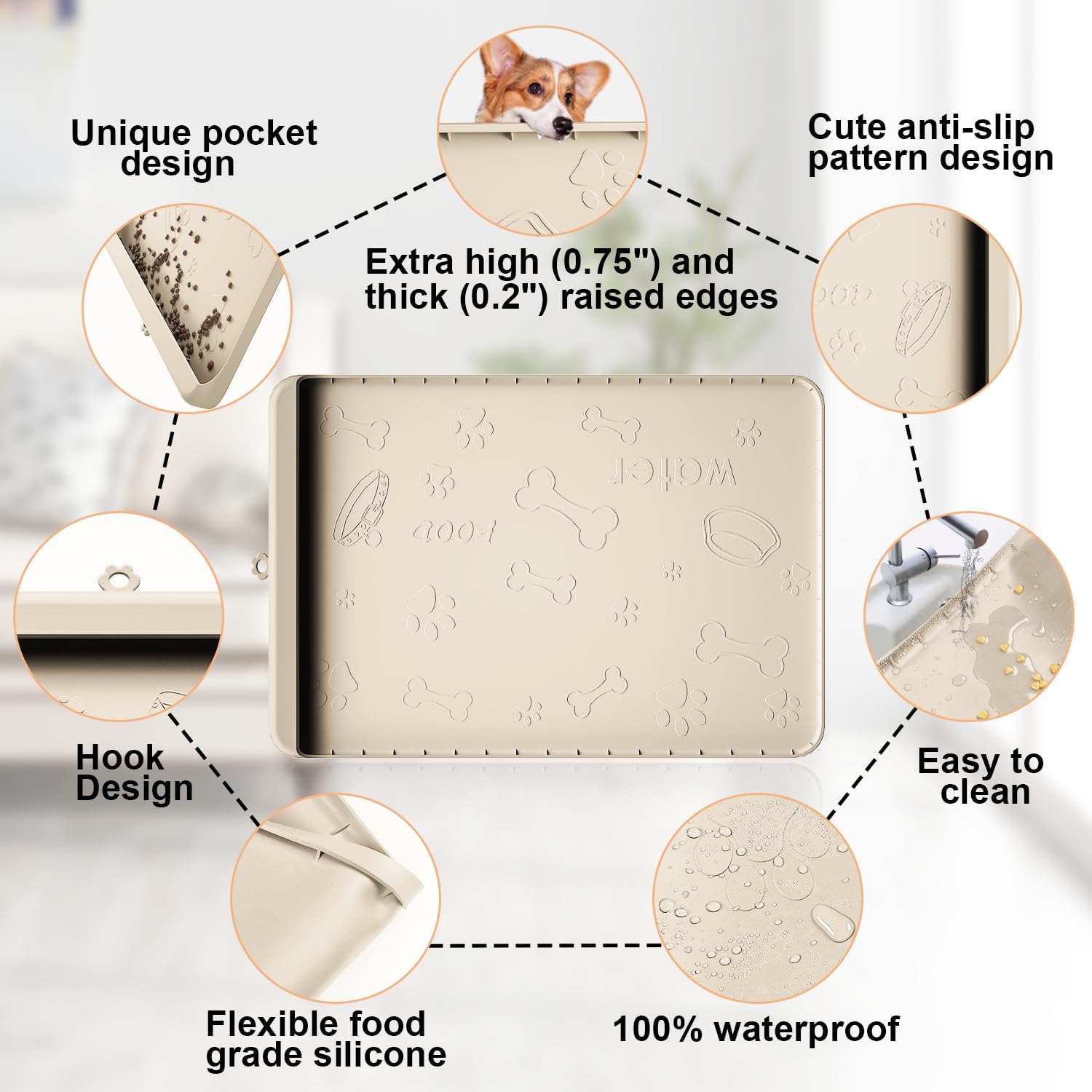 Silicone Dog Feeding Mat - 36" x 24" Large Pet Mat with Residue Collection Pocket and High Edges - Waterproof Mat for Dog and Cat Bowls