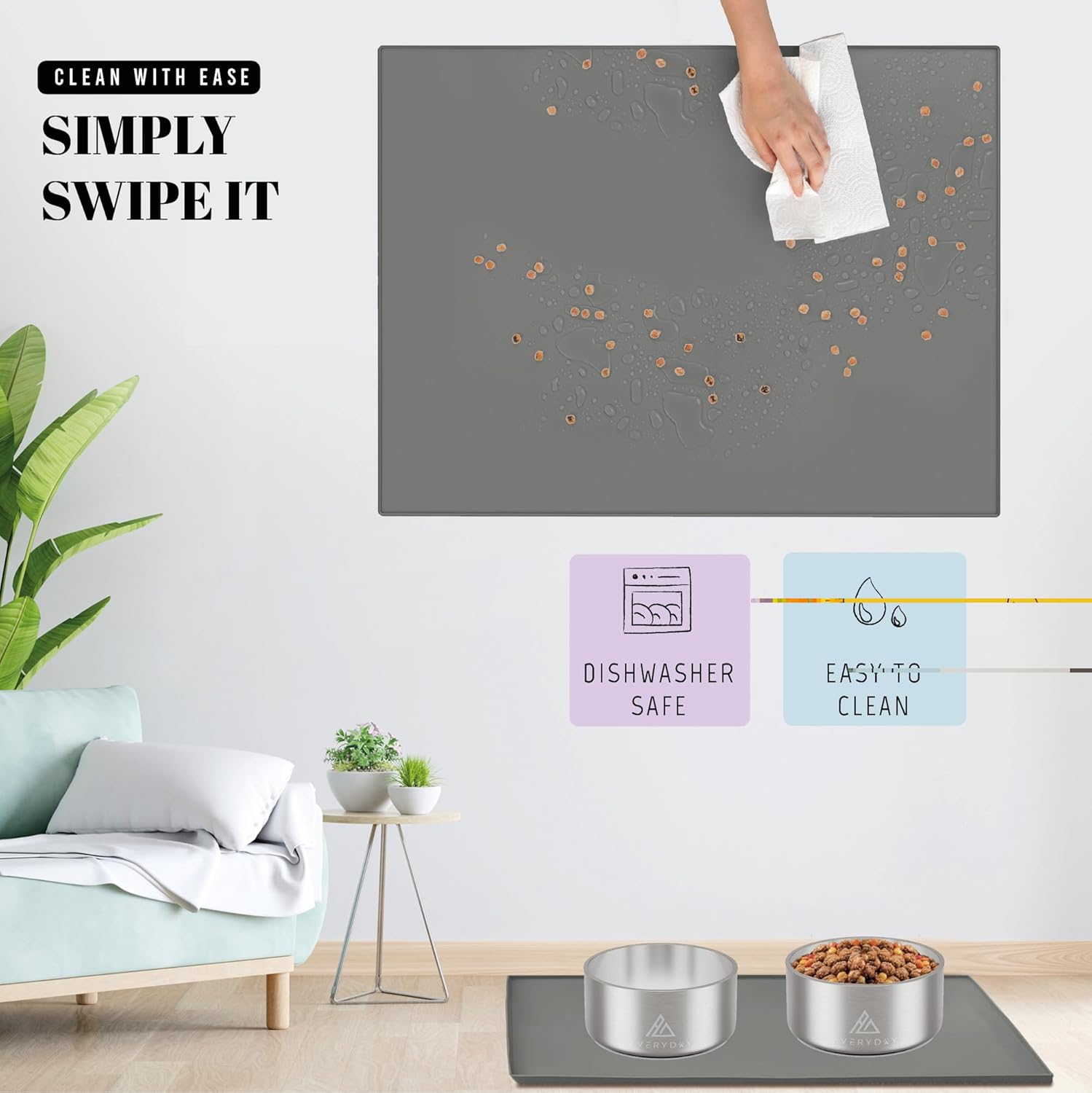 - Floor Protection: Protect your wood floor with our waterproof dog feeding mat. Thick and durable, this mat shields against spills and stains from dog or cat food and water bowls. Say goodbye to mildew worries. Ideal for pet owners who value clean and pristine floors