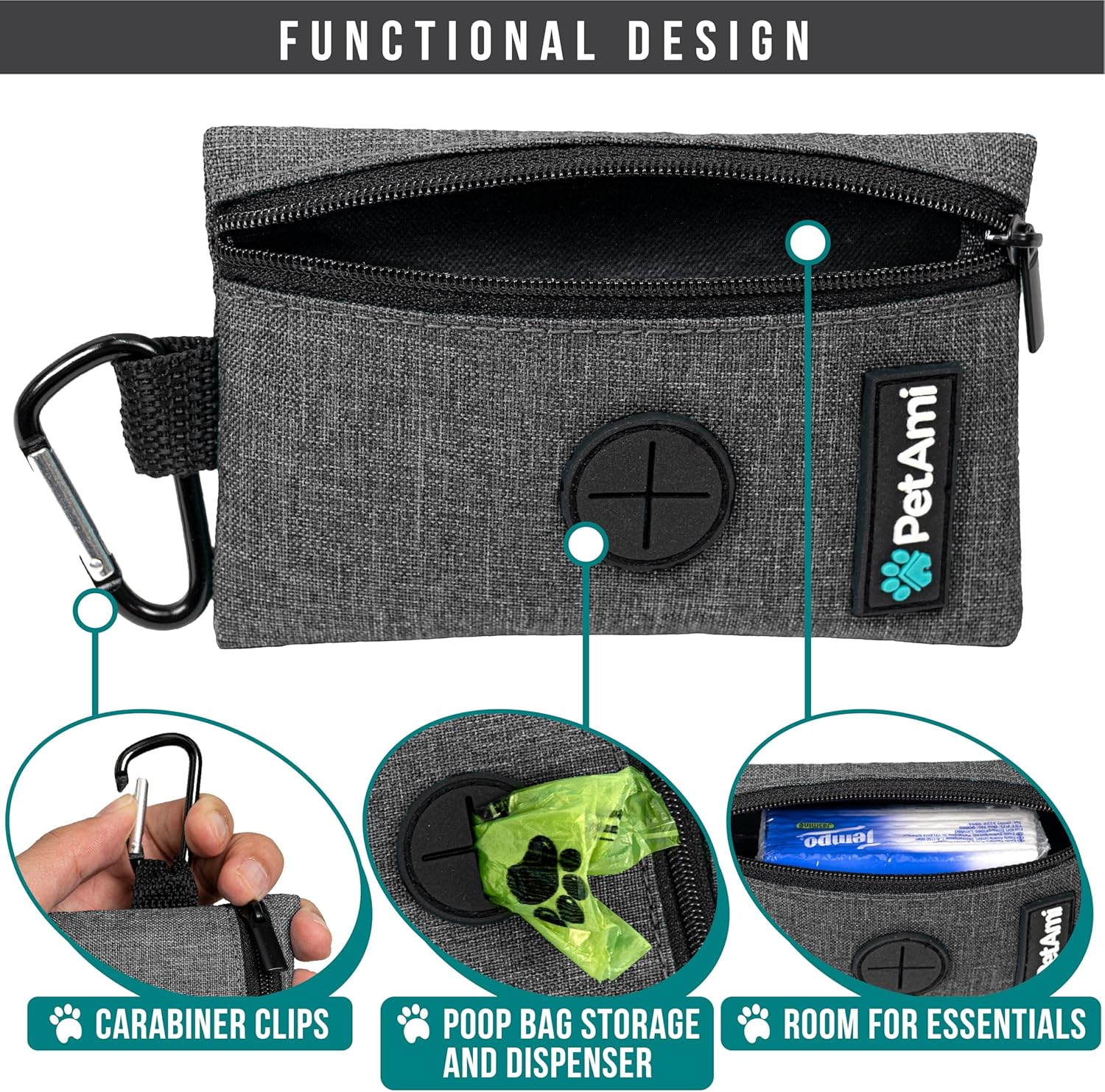 PetAmi Dog Poop Bag Holder for Leash, Dog Waste Bag Dispenser with Clip, Treat Pouch, Walking & Camping Accessory with Trash Bag Roll, Gray 1 Pack