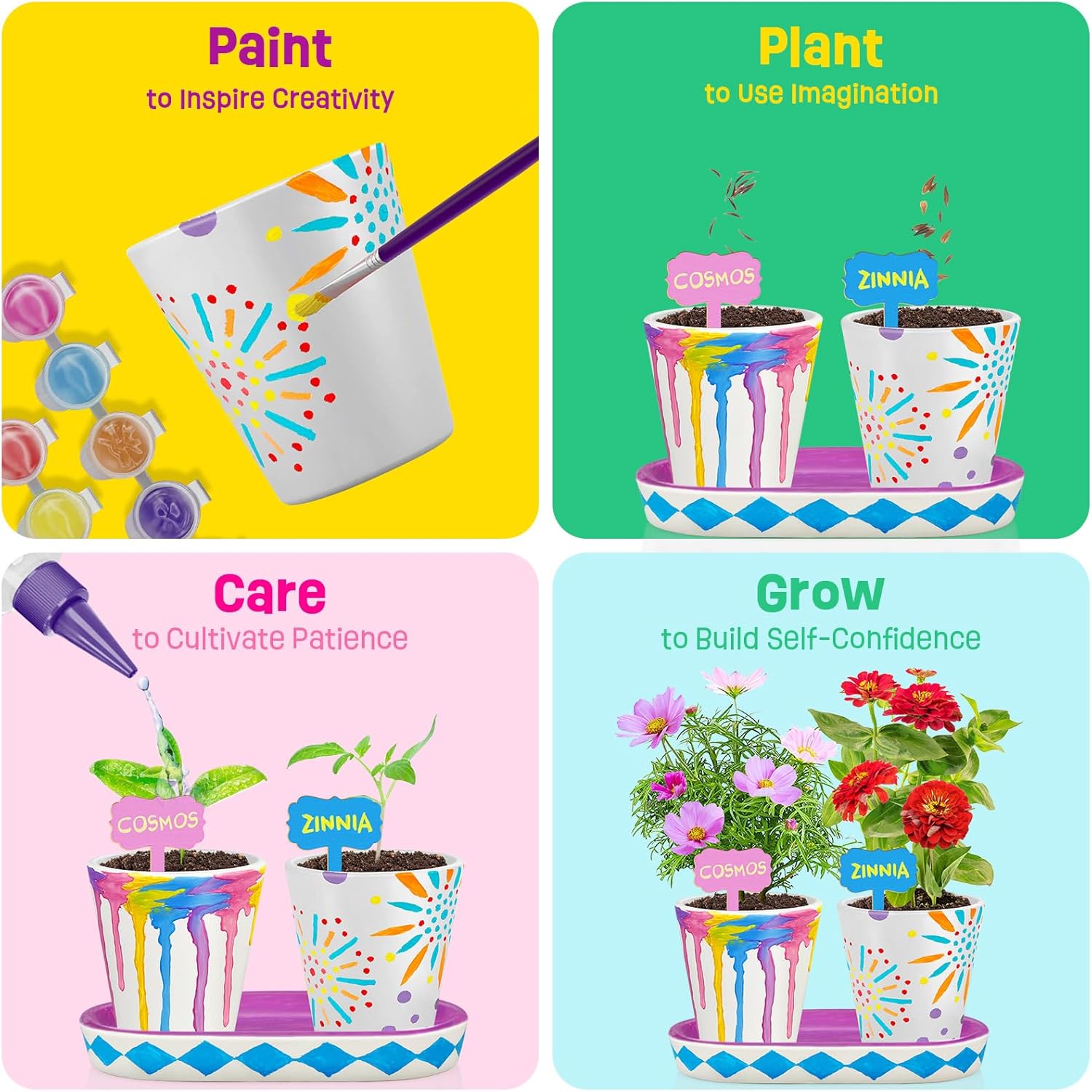 - 4 SET GARDEN KIT: Paint the 4 ceramic pots, 2 ceramic trays, and plant markers, and sow the Marigold, Cosmos, Zinnia and Portulaca flowers with imagination and patience. Have fun while crafting with the included step-by-step instructions.