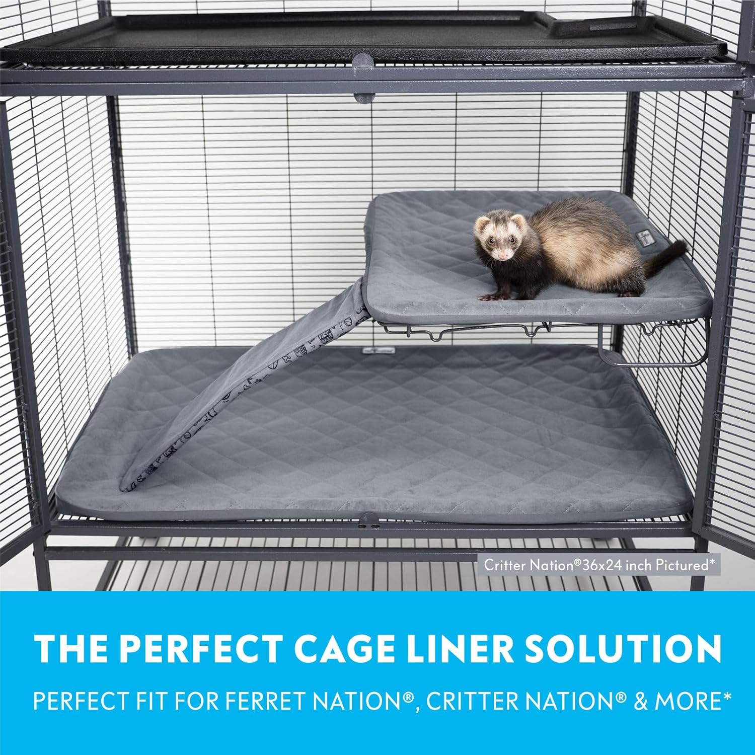 - PERFECT FIT: Designed specially for use with the Ferret Nation and Critter Nation* single unit cage. A stretchy elastic bottom band makes the liner easy to put on and secure over the trays, and two flexible wide straps reinforce the liner for a perfectly tight fit. The ramp cover slides on to the ramp and is secured with a strong hook-and-loop (velcro) closure.