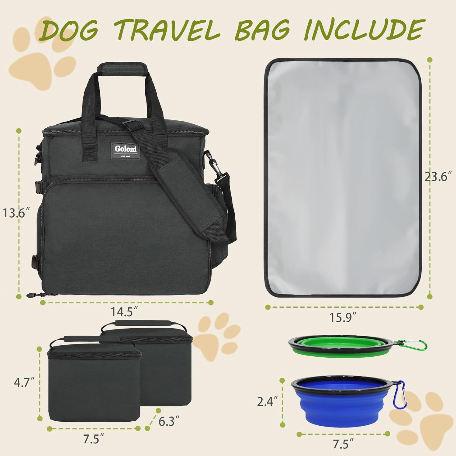 - All-in-One Travel Kit – Includes 1 premium tote bag, 2 airtight food containers, 2 collapsible silicone bowls, and 1 waterproof feeding mat—everything you need for hassle-free trips
