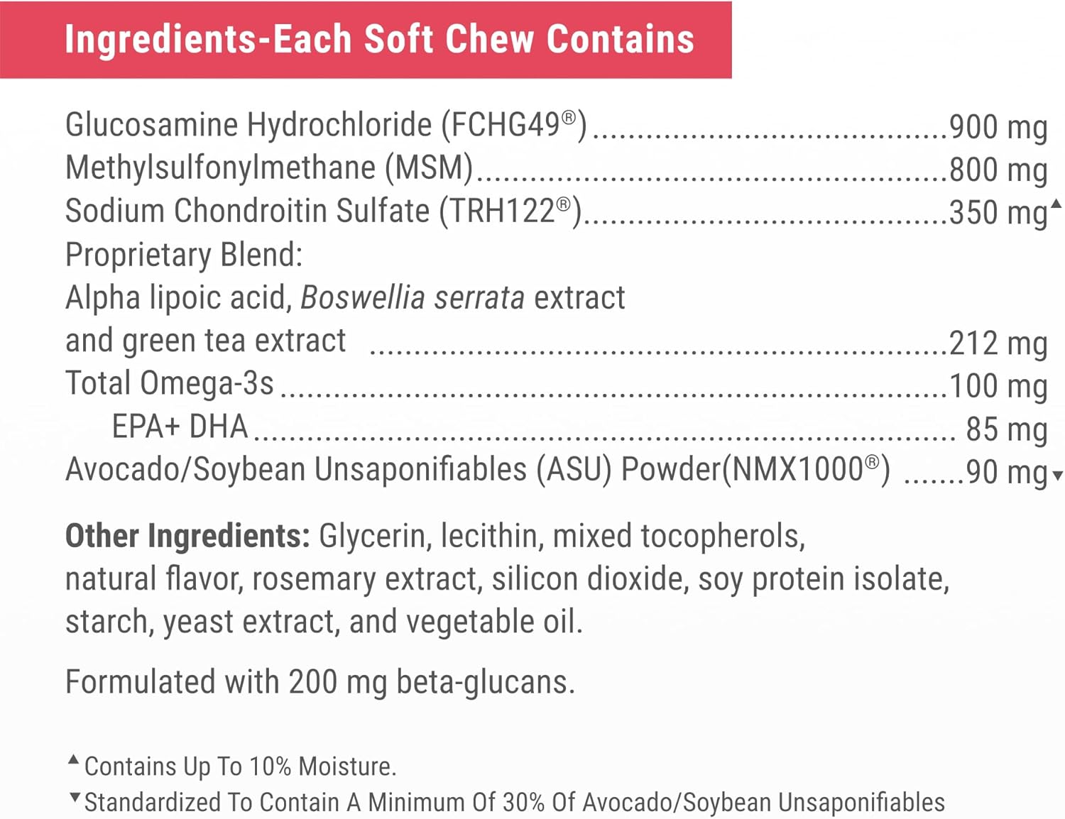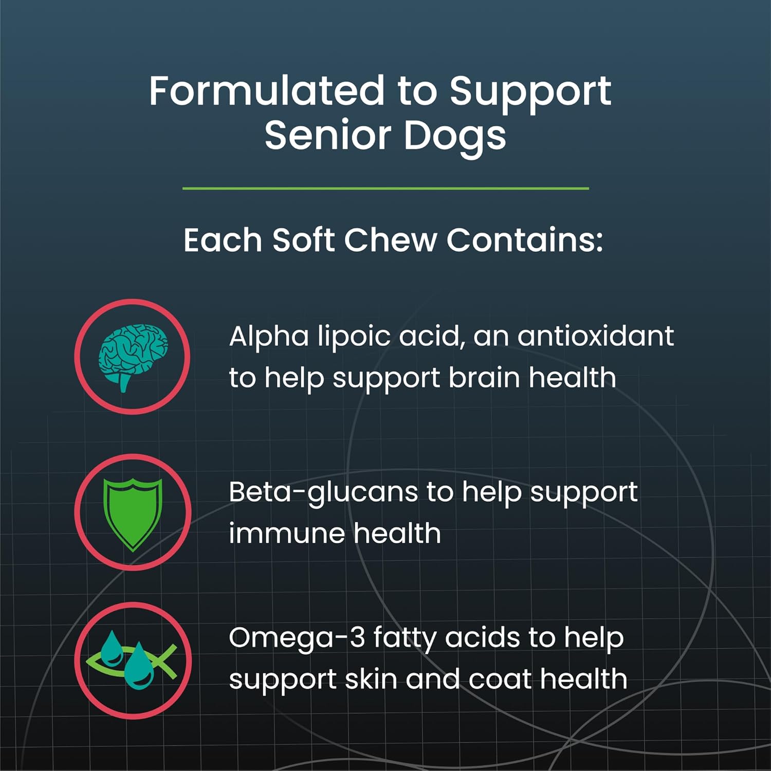 - Omega-3 Fatty Acids and Beta-Glucans: Each soft chew contains omega-3 fatty acids to help support skin and coat health and beta-glucans for immune support