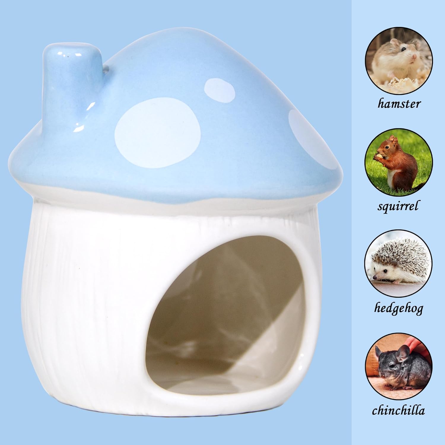 - Mushroom house: The mushroom ceramic house can be used as a decorative to add color to your pet. Add a little of whimsy to your small pet cage with our chinchillas cage accessories