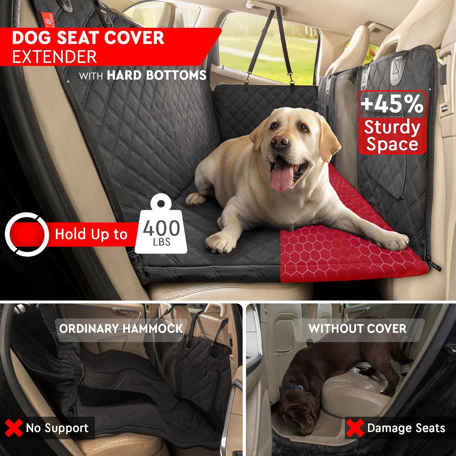 - Hard Bottom & Seat Extension - A hard bottom dog hammock for a car is more sturdy and stable than a soft bottom seat cover and can hold up to 400 pounds. The padded hard bottom has built-in 7-layer protection, and plates made of PP which are more durable than a wood base. The hard bottom cover will extend your bench seats by 45% to create a comfortable place for your pets.