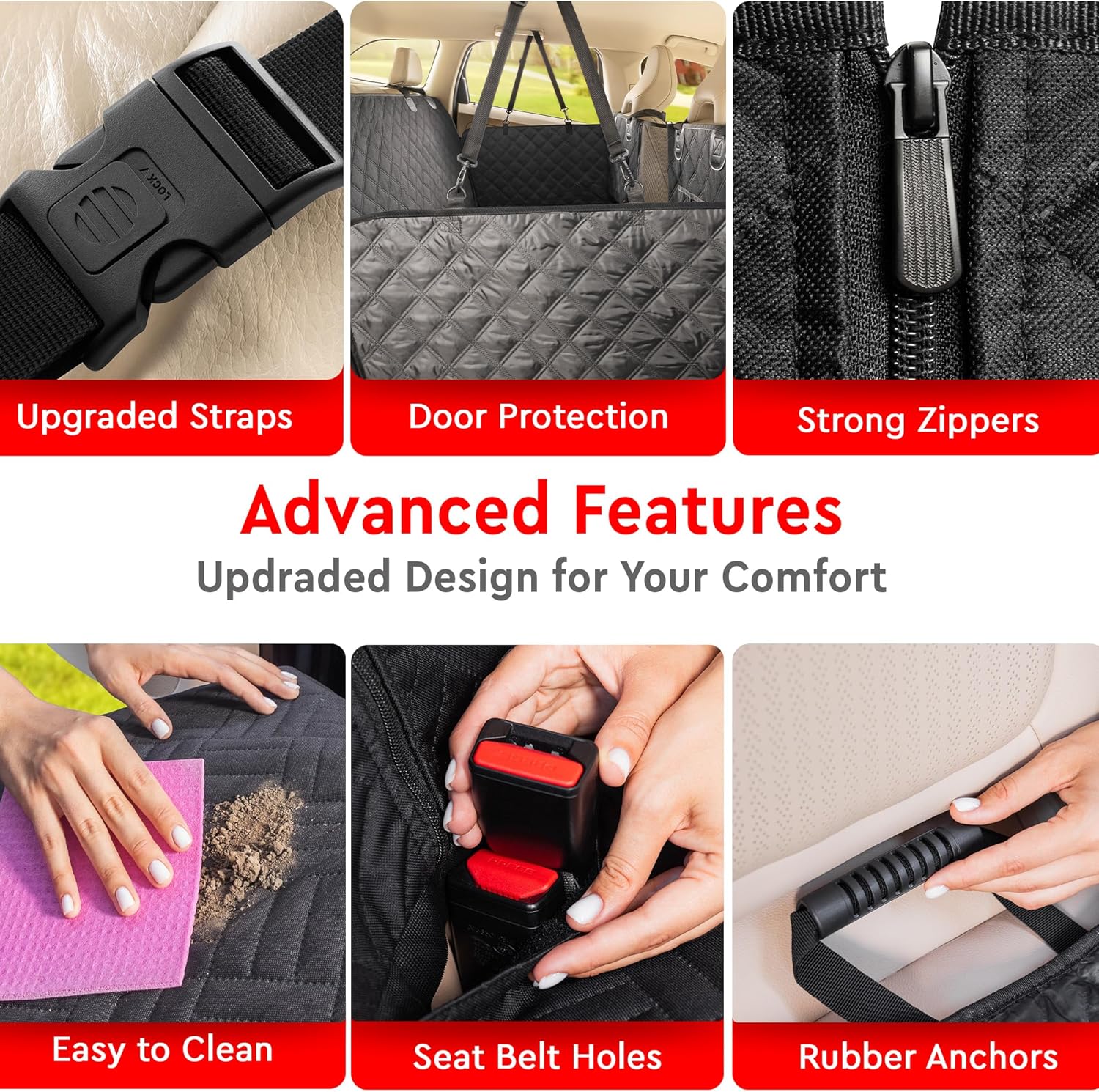 - Upgraded Design – Features a durable net between front seats, 2 storage pockets, and easy access for seat belt buckles. Enhanced straps, buckles, and zippers offer added reliability. Non-slip backing and rubber hangers keep the seat cover secure. Includes a storage bag for convenience.