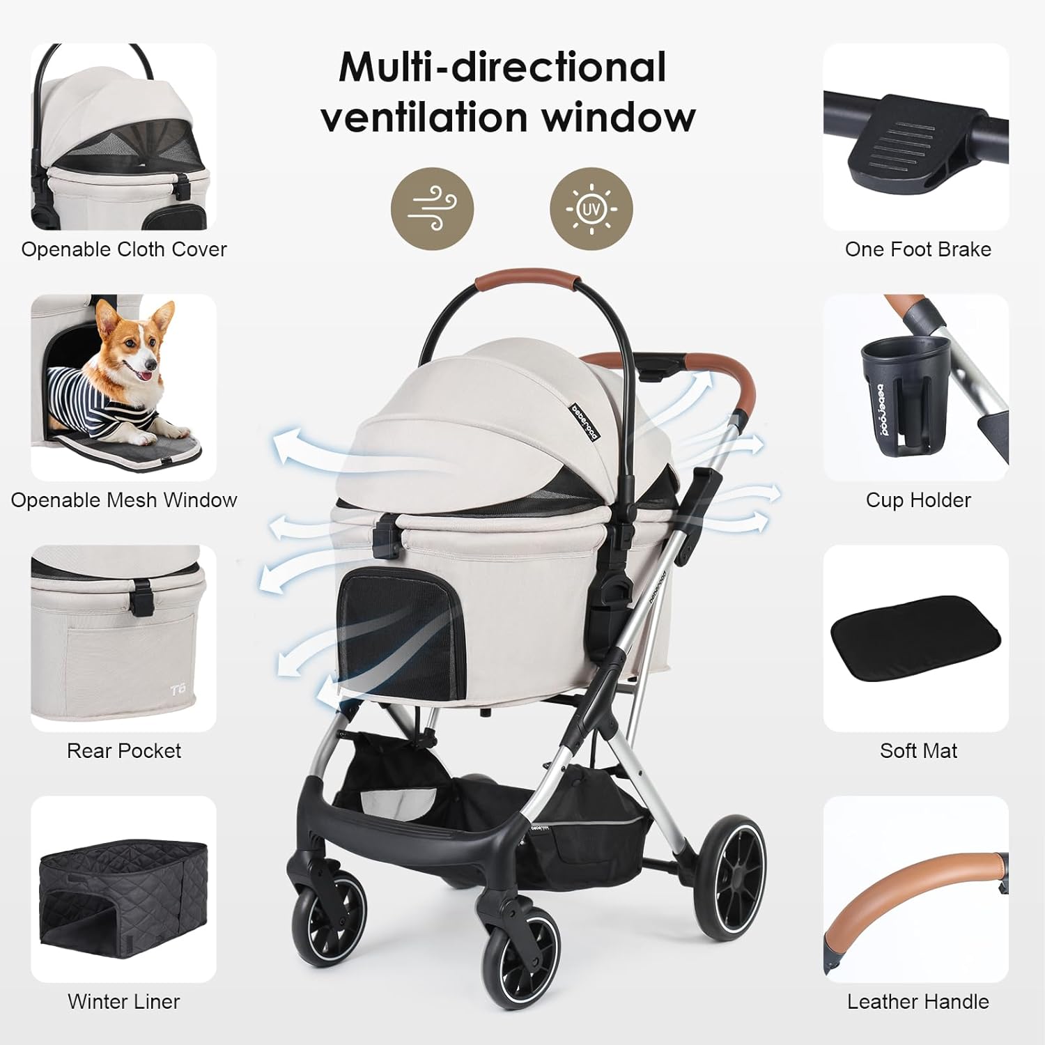 T6 Luxury Pet Stroller for Medium Dogs Up to 66lbs or 2 Small Pets – 3-in-1 Dog & Cat Stroller with Removable Carrier, Foldable & Lightweight (Beige)