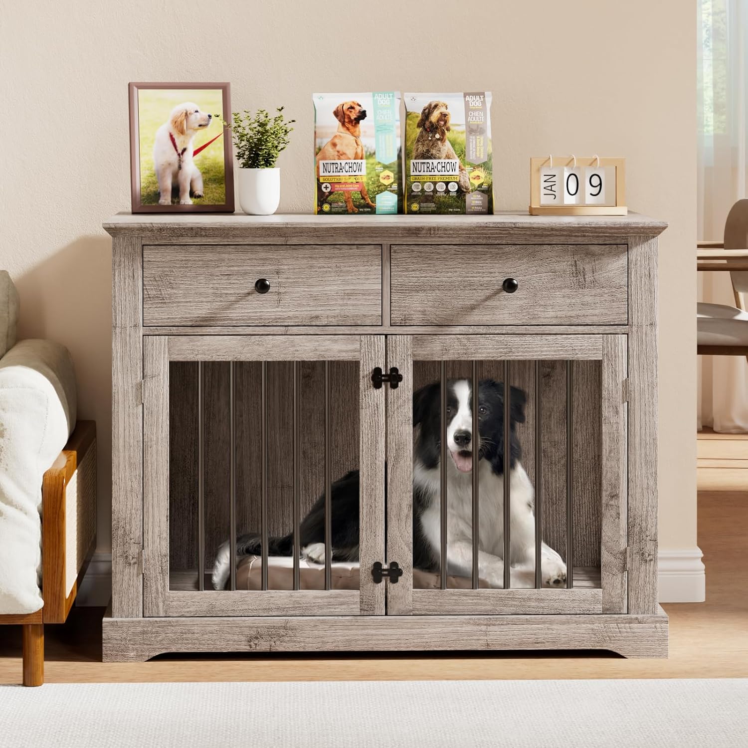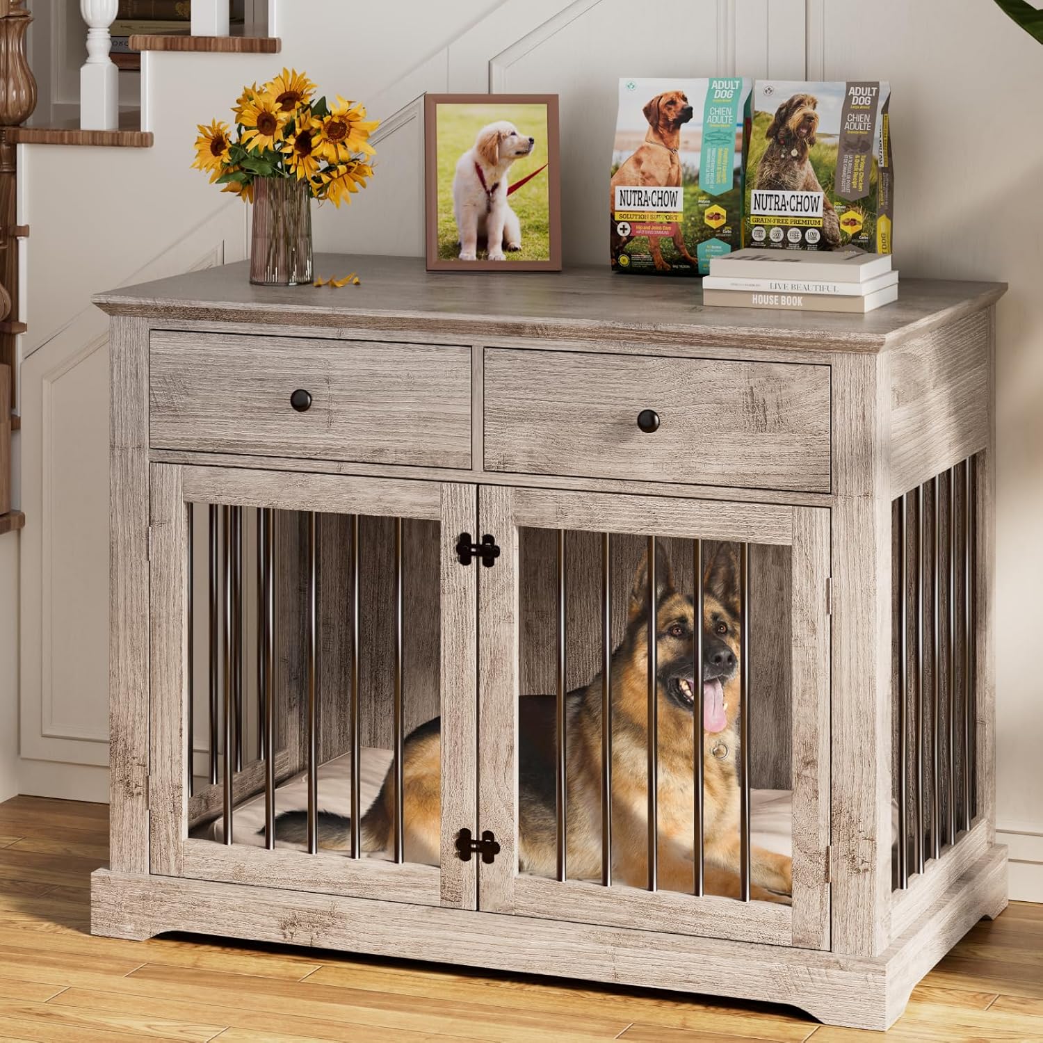 - Double Large Drawers: This decorative wood dog crate kennel has the wide desktop that you can display decorations such as plants, magazines, picture frames, night light and so on. And it equipped with 2 drawers, which provide extra storage space.Perfect for storing dog supplies (toys, leashes, etc.) or others