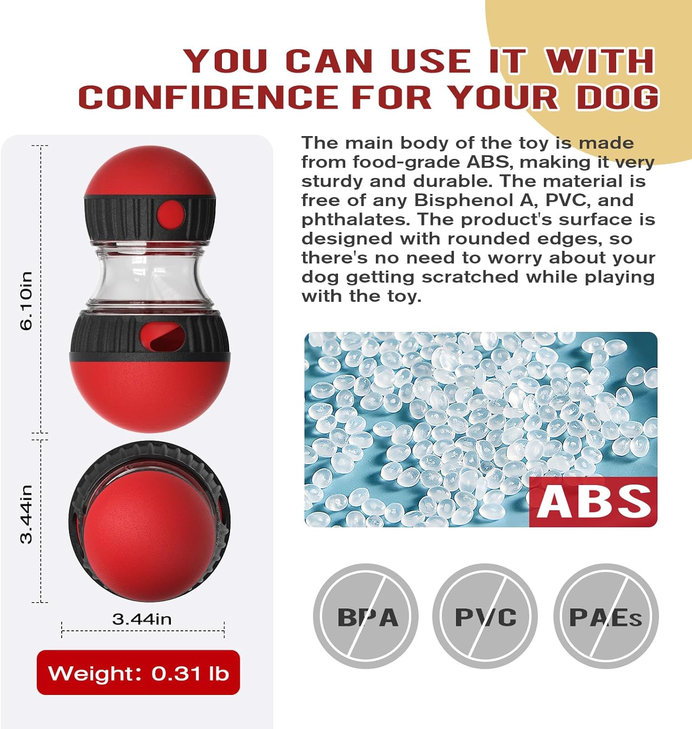 - [Treat Distribution] Our food dispenser has differently sized spheres at both ends. As dogs push the toy, it moves within a fixed area, allowing dogs to continuously chase and play with it. During movement, food is dispensed from the food holes on both sides of the toy.