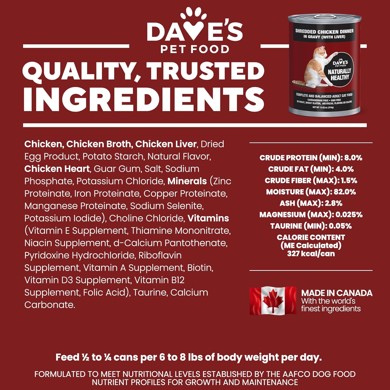 - TRULY GREAT FOOD, MADE IN CANADA, REASONABLE PRICE. Dave’s mission is to provide yummy, nutritious, high-quality food for cat owners seeking healthy options at an affordable price. Made in the Canada with the finest domestic & imported ingredients.