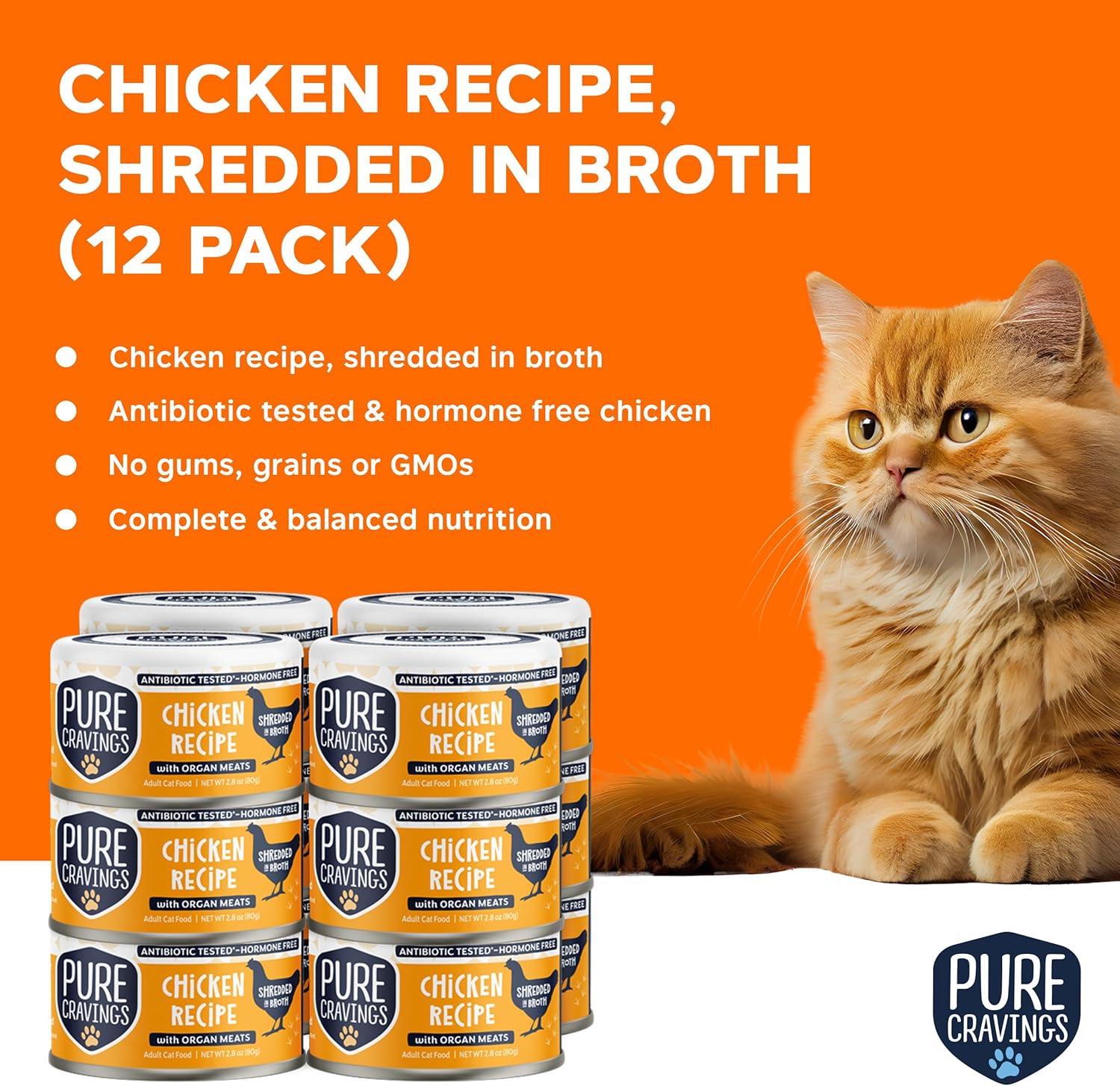 Chicken Recipe in Broth, Shredded Wet Cat Food, Grain-Free Protein, Non-GMO, 12 Pack