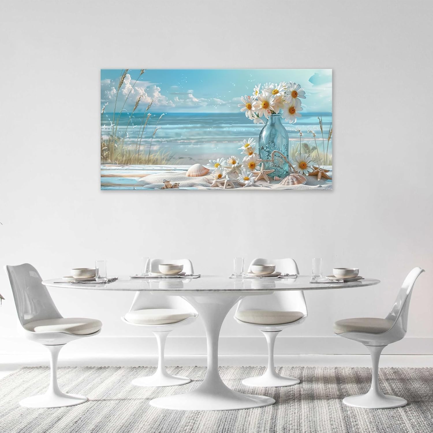 Large Beach Wall Art for Living Room Flower Daisy Art Big Space Size Framed Ocean Shell Canvas Prints Blue Pictures Painting Artwork Office Bedroom Home Decor 60"x30"
