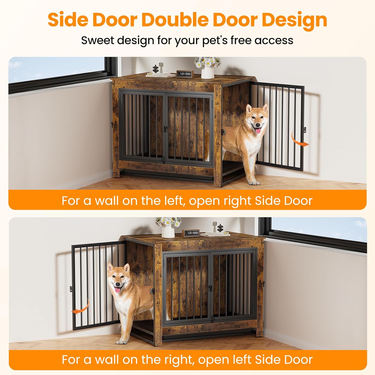- 🐶【Double Side Door Design】This furniture-style dog kennel indoor has front and two side openings for access, both the left side door and the right side door can be opened to fit various spaces, definitely an ideal crate for your home