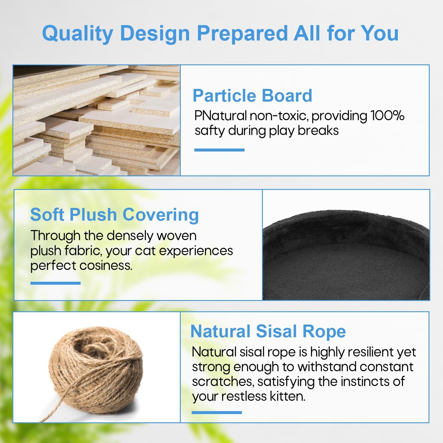 - 🐱 【Posts for Scratching Covered in Sisal 】These are scratching surfaces that are integrated into the framework. Cats love to bury their claws in sisal because it's a sturdy substance with a coarse texture. Our cat tree promotes healthy scratching habits and helps discourage cats from damaging furniture by offering dedicated spaces for them to scratch.