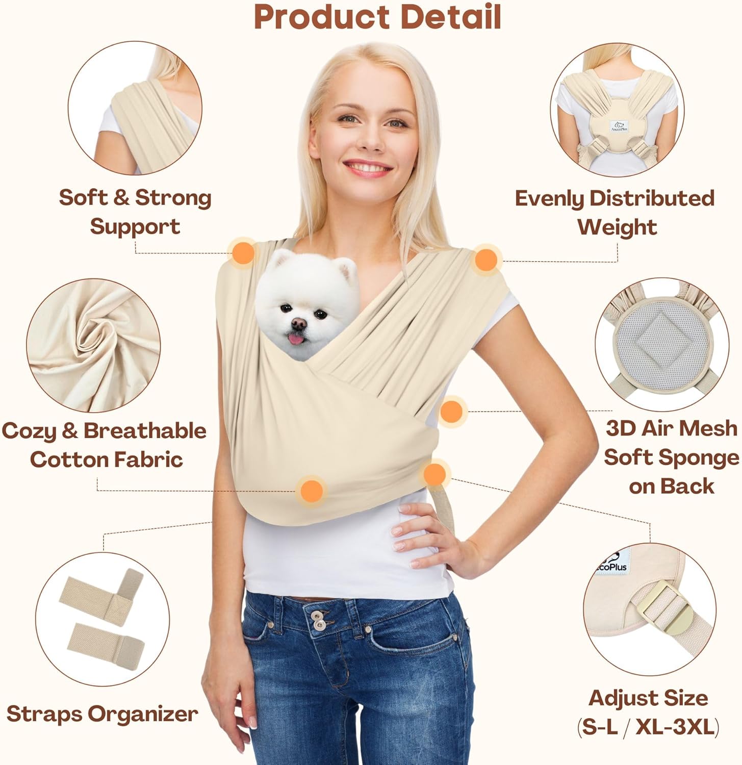 - [SIMPLE SIZE & PERFECT FIT] Please measure your fullest part of your bust and choose your size on the size chart. There are two simple sizes, Regular (S~L) and Plus (XL~3XL). Regardless of your size, our dog carrying sling is designed as small dog carrier up to 20lbs(9kg). The 95% Cotton is extra soft, and the 5% Spandex gives the elasticity which allows our dog sling carrier for small dogs to conform to your pet's shape, ensuring maximum comfort for both you and your pet during use