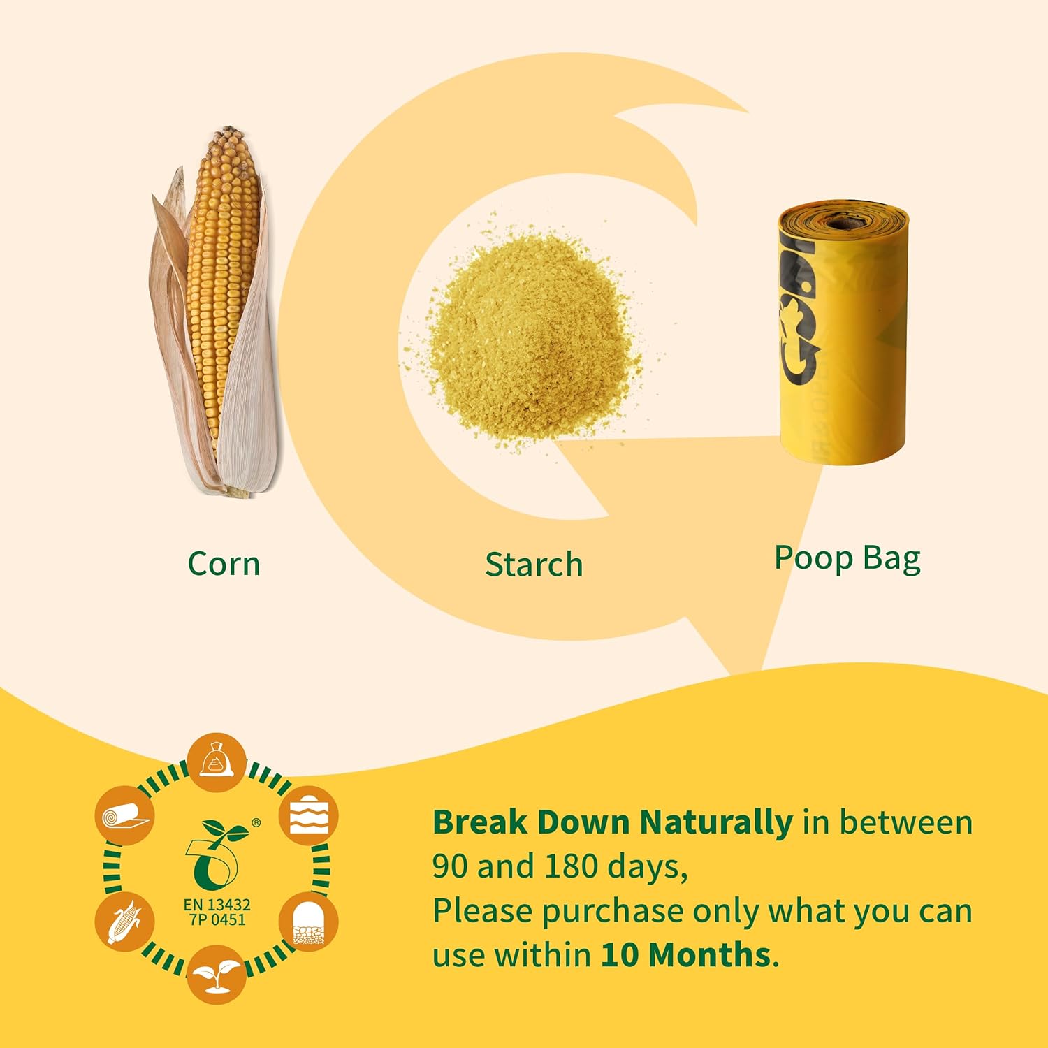 - 🌱 ECO-friendly materials: Codirom dog poop bags are made of corn, vegetable oil, and PBAT (a fully compostable polymer). Keep the bags away from heat sources and store in a cool, dry place. The available time of compostable bags is nearly 12 months, so purchase only that will be used within 10 months.