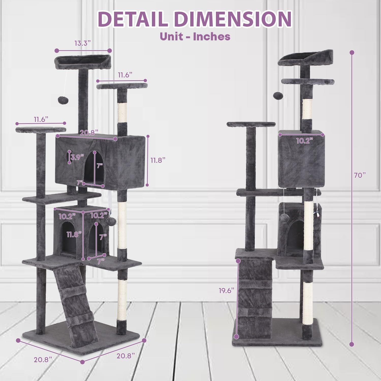- Multi-Functional Cat Tower:This 70-inch cat tree has a small footprint and provides a diverse activity area for cats This cat tree is equipped with hanging toys that stimulate play and prey instincts and satisfy your cat's instincts and desire for adventure.