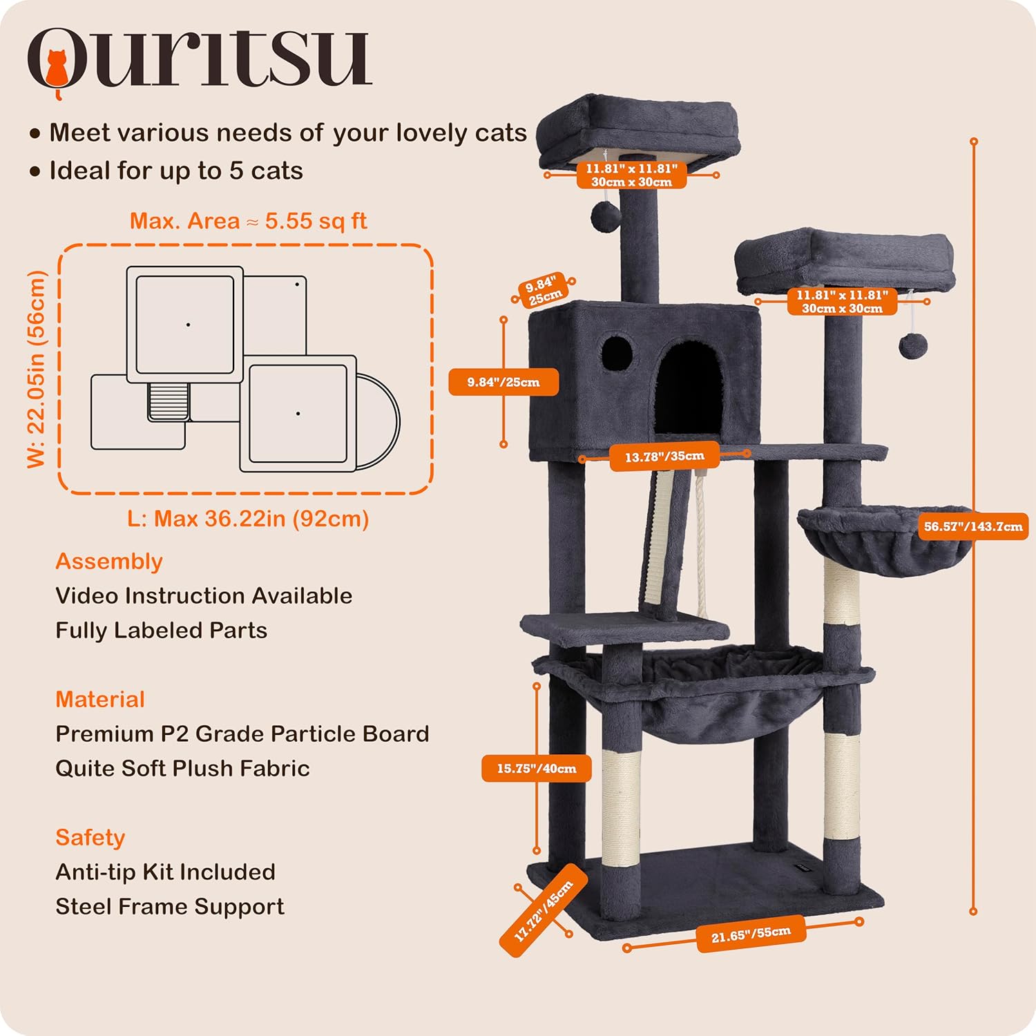 Ouritsu Cat Tree, 56 inch Tall Cat Tower for Large Cat Indoor, Large Condo, 2 Padded Perches, Steel-Framed Hammock, Scratching Post and ramp, Fluffy Basket, Dark Gray, LF001DG