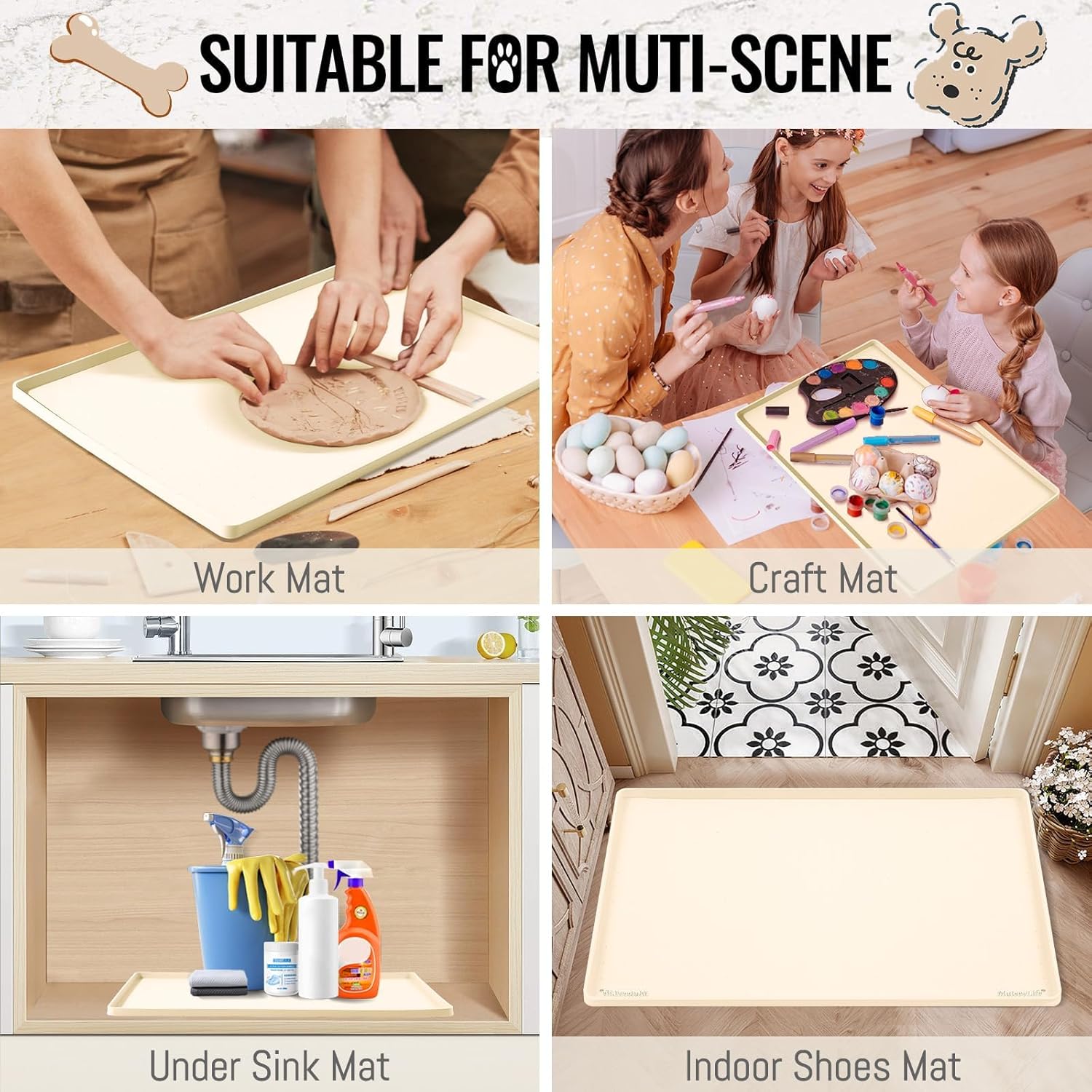 MateeyLife Dog & Cat Food Mat for Floors Waterproof, Nonslip Pets Bowl Mats for Dining and Drinking, Dogs Feeding Mats with Raised Edges, Silicone Cats Matt Tray for Messy Drinkers, 24"x16", Beige